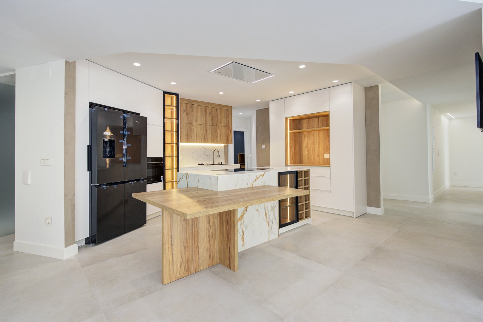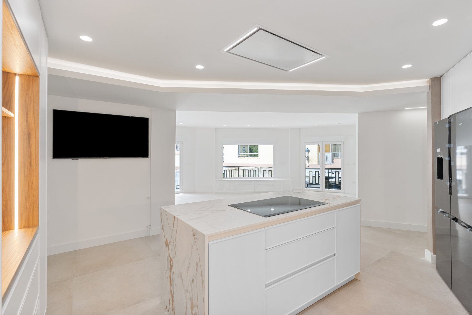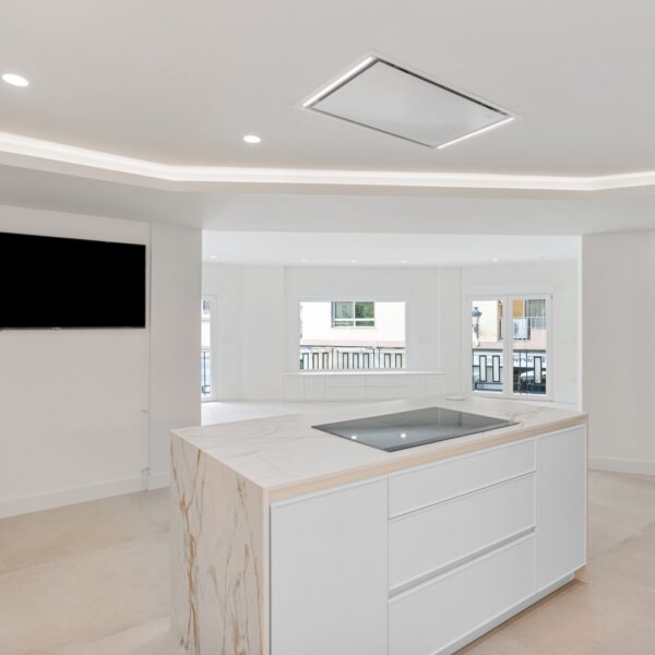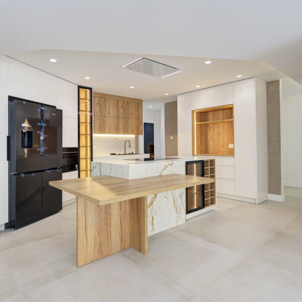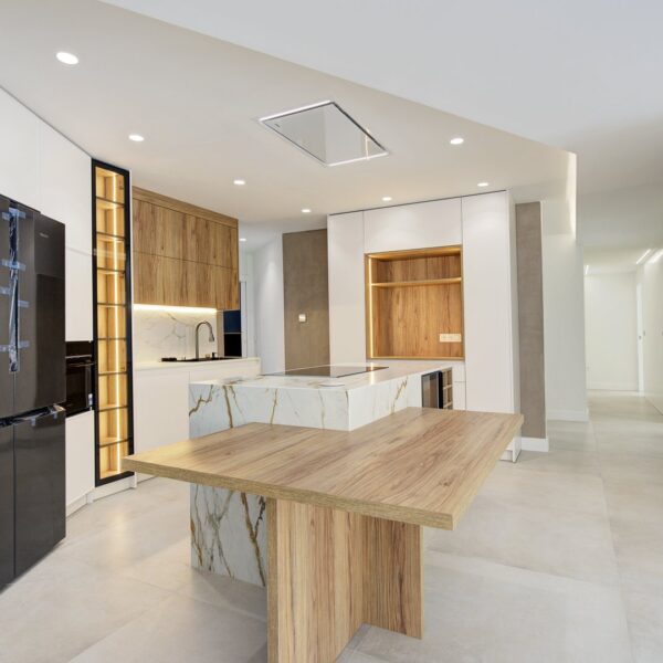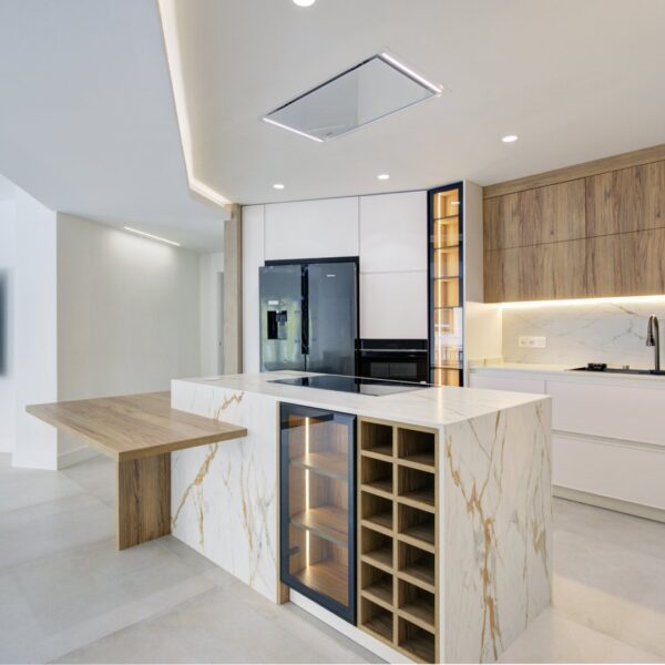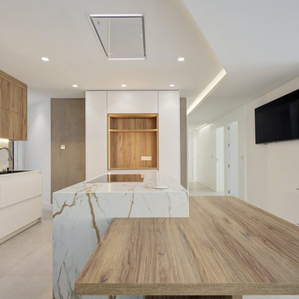 El inmueble se organiza en una distribución excepcional que favorece tanto el confort como la estética. Su gran protagonista es la impresionante cocina con isla central, diseñada como un espacio de encuentro y convivencia, completamente abierta al salón, que a su vez se conecta con una terraza en esquina a través de amplios ventanales que potencian la luminosidad natural. La zona de noche destaca por una suite principal de gran amplitud, con baño privado que incluye ducha y una bañera exenta de diseño, creando un auténtico oasis de bienestar. Además, cuenta con tres dormitorios más, todos ellos espaciosos y con armarios empotrados, un segundo baño completo, un práctico lavadero amueblado, terraza interior y un elegante hall de entrada con un gran armario de cortesía y almacenaje.