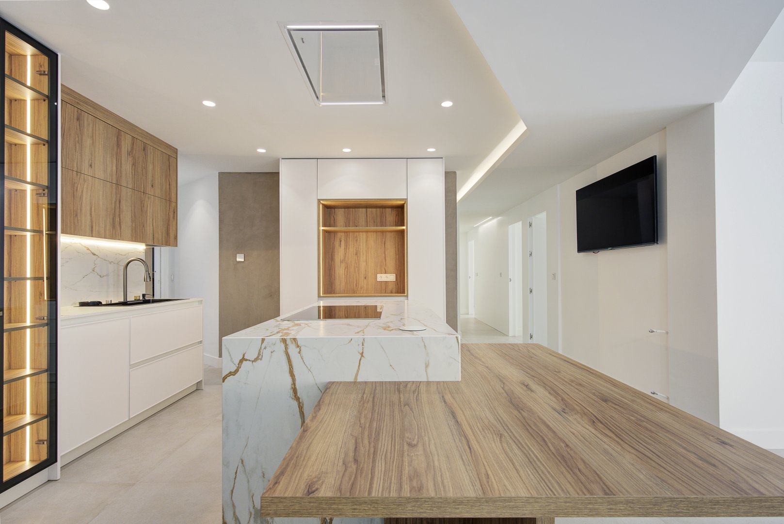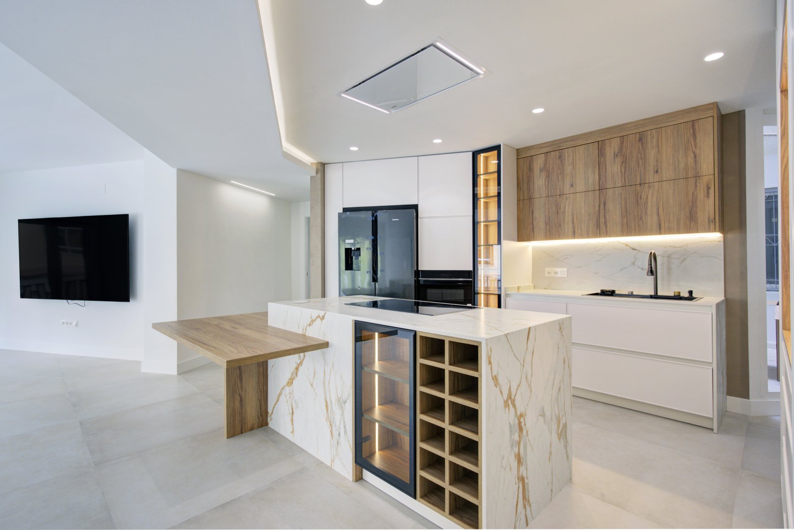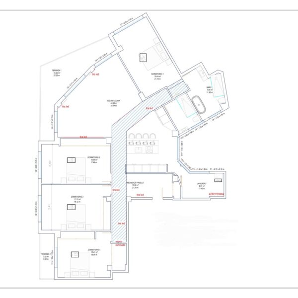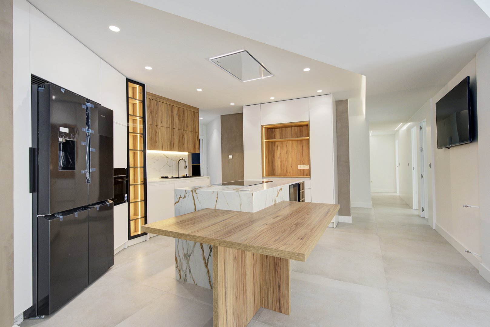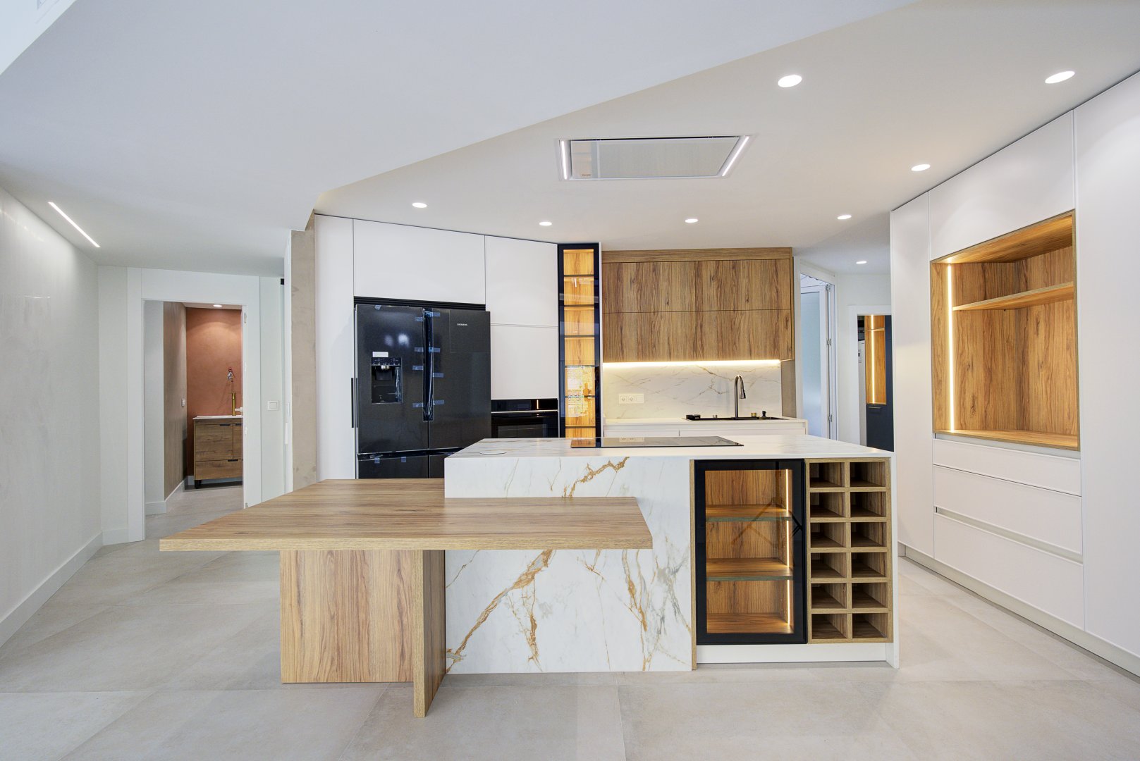 El inmueble se organiza en una distribución excepcional que favorece tanto el confort como la estética. Su gran protagonista es la impresionante cocina con isla central, diseñada como un espacio de encuentro y convivencia, completamente abierta al salón, que a su vez se conecta con una terraza en esquina a través de amplios ventanales que potencian la luminosidad natural. La zona de noche destaca por una suite principal de gran amplitud, con baño privado que incluye ducha y una bañera exenta de diseño, creando un auténtico oasis de bienestar. Además, cuenta con tres dormitorios más, todos ellos espaciosos y con armarios empotrados, un segundo baño completo, un práctico lavadero amueblado, terraza interior y un elegante hall de entrada con un gran armario de cortesía y almacenaje.