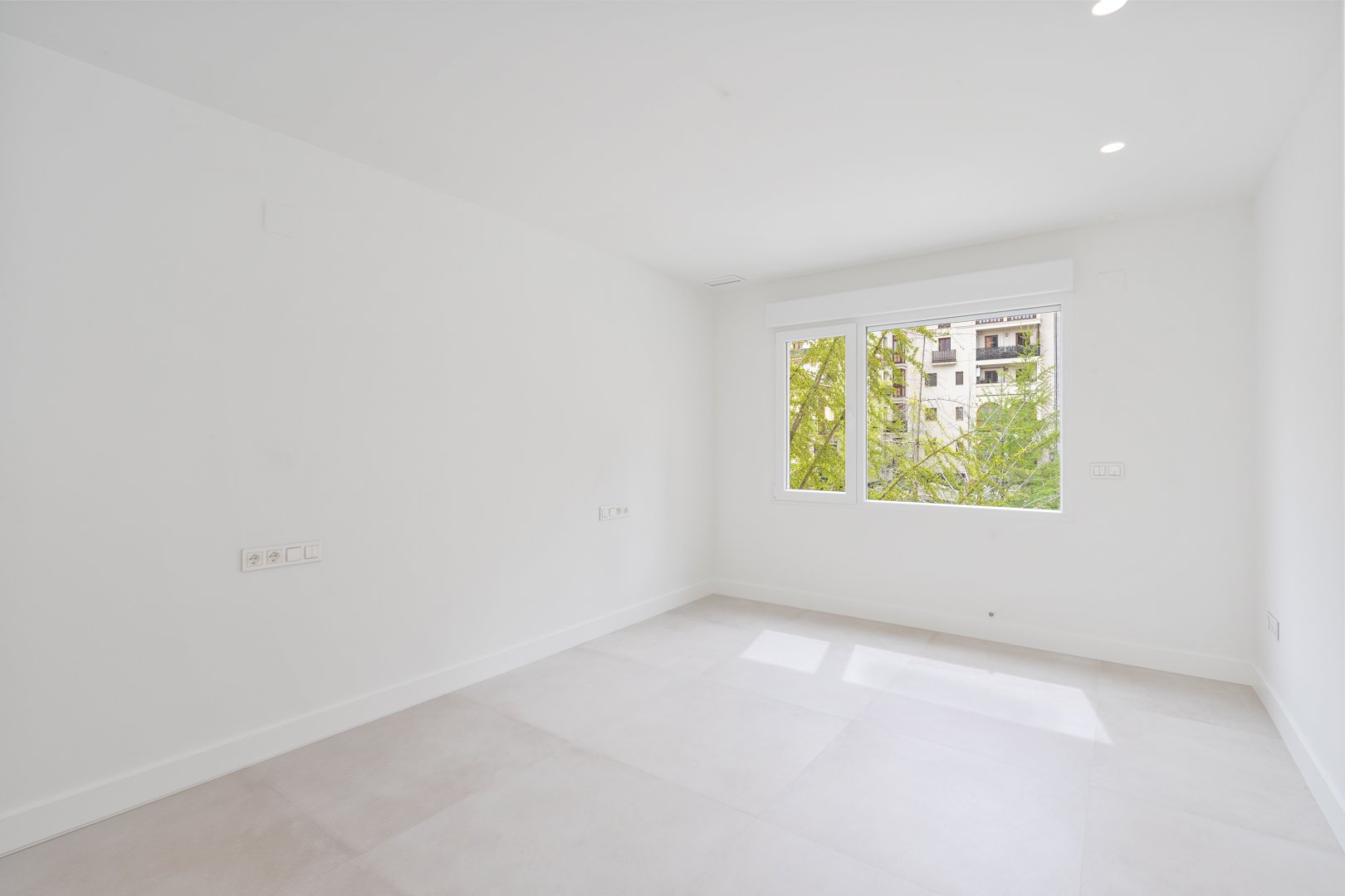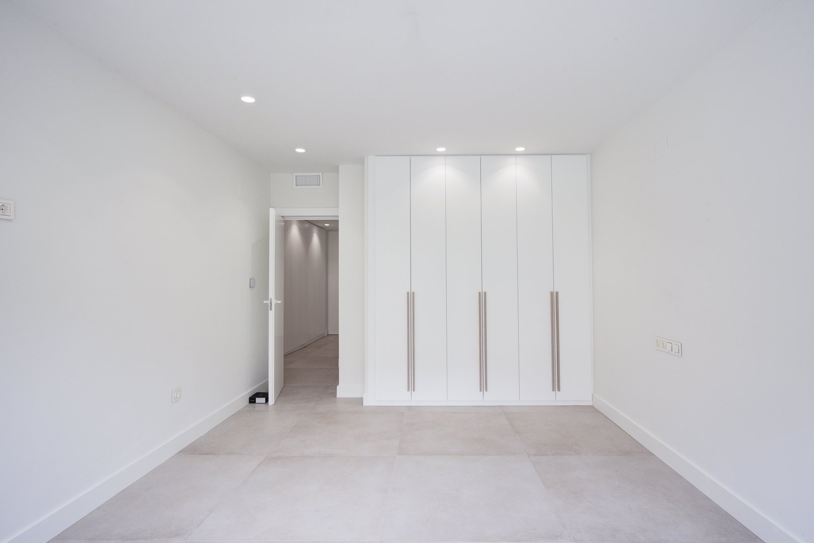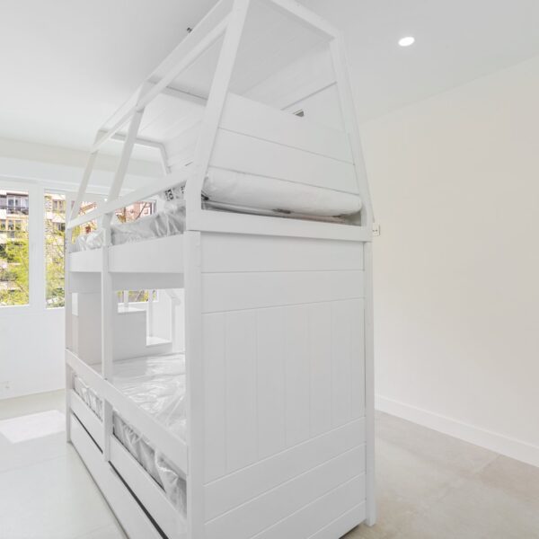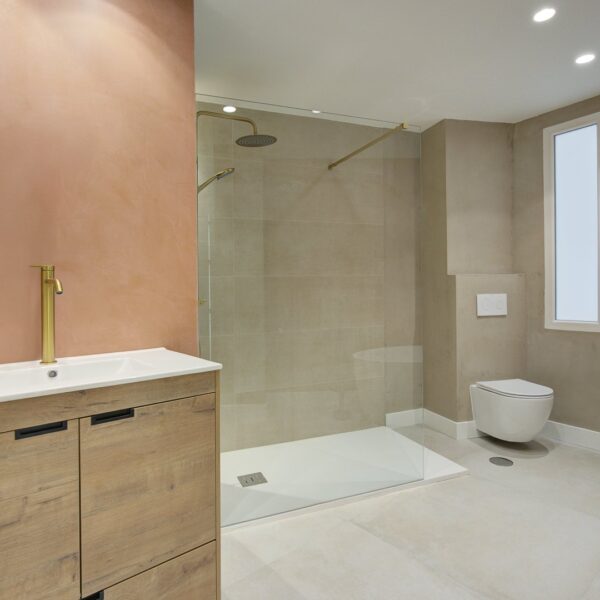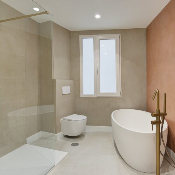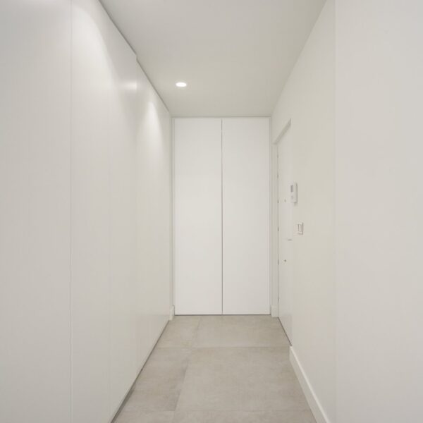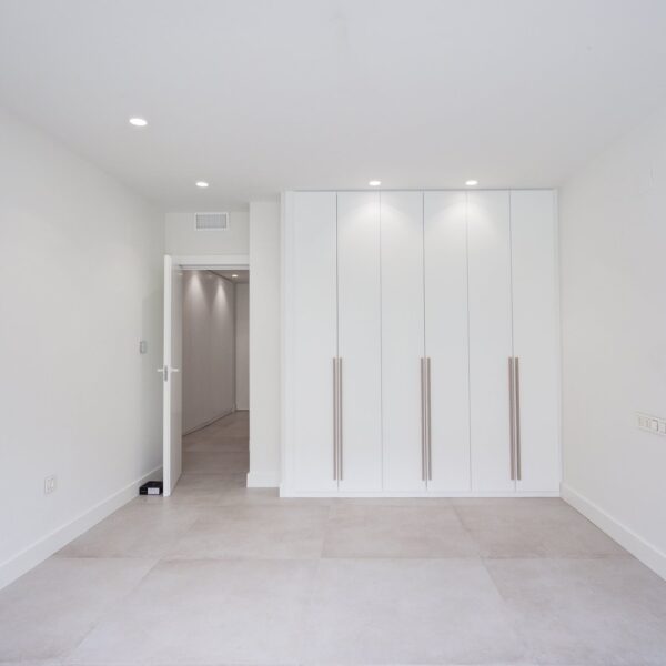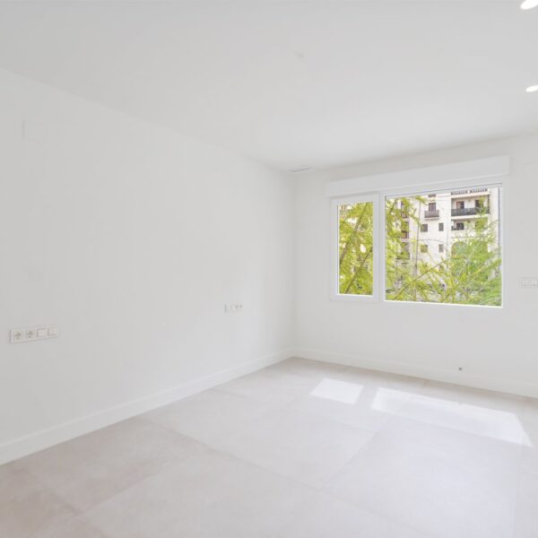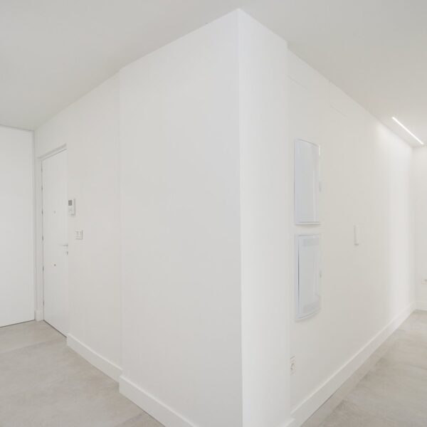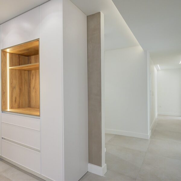 En cuanto a calidades, esta propiedad ha sido concebida bajo los más altos estándares. Dispone de un sistema de suelo radiante-refrigerante por aerotermia, climatización sectorizada por conductos mediante sistema Airzone, e instalación de calefacción central comunitaria ya preparada (a falta de radiadores). Las puertas interiores lacadas en blanco, los panelados con puertas invisibles integradas, y los suelos porcelánicos de gran formato refuerzan la sensación de armonía y continuidad en todos los espacios. La carpintería exterior de PVC con doble rotura de puente térmico y persianas motorizadas marca Schüco aseguran aislamiento térmico y acústico excepcionales. La vivienda incluye además un sistema de aspiración centralizada, instalación eléctrica moderna con tomas USB e internet en todas las estancias, y una iluminación arquitectónica con luminarias encastradas y foseados que aportan calidez y estilo. La cocina de alta gama equipada con electrodomésticos Siemens, los acabados en microcemento en cocina y baños, grifería y sanitarios premium, azulejos de diseño en duchas, y estucos en zonas comunes, completan una intervención arquitectónica impecable.