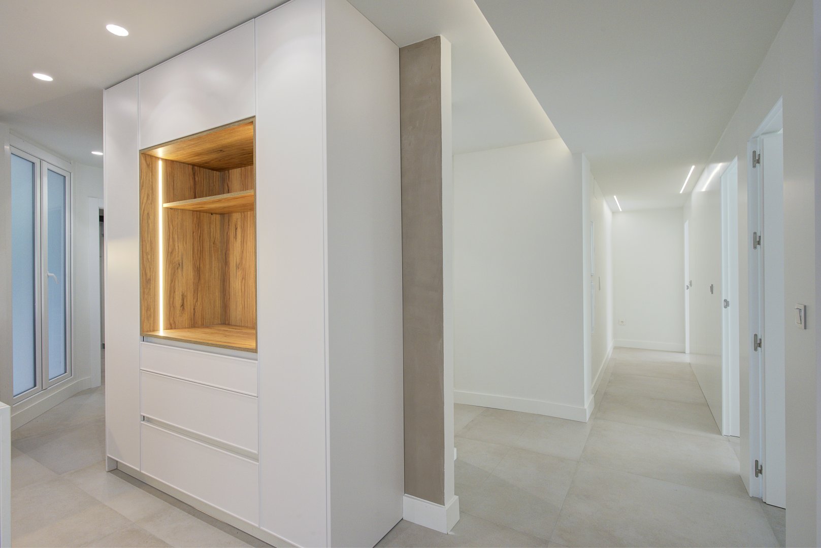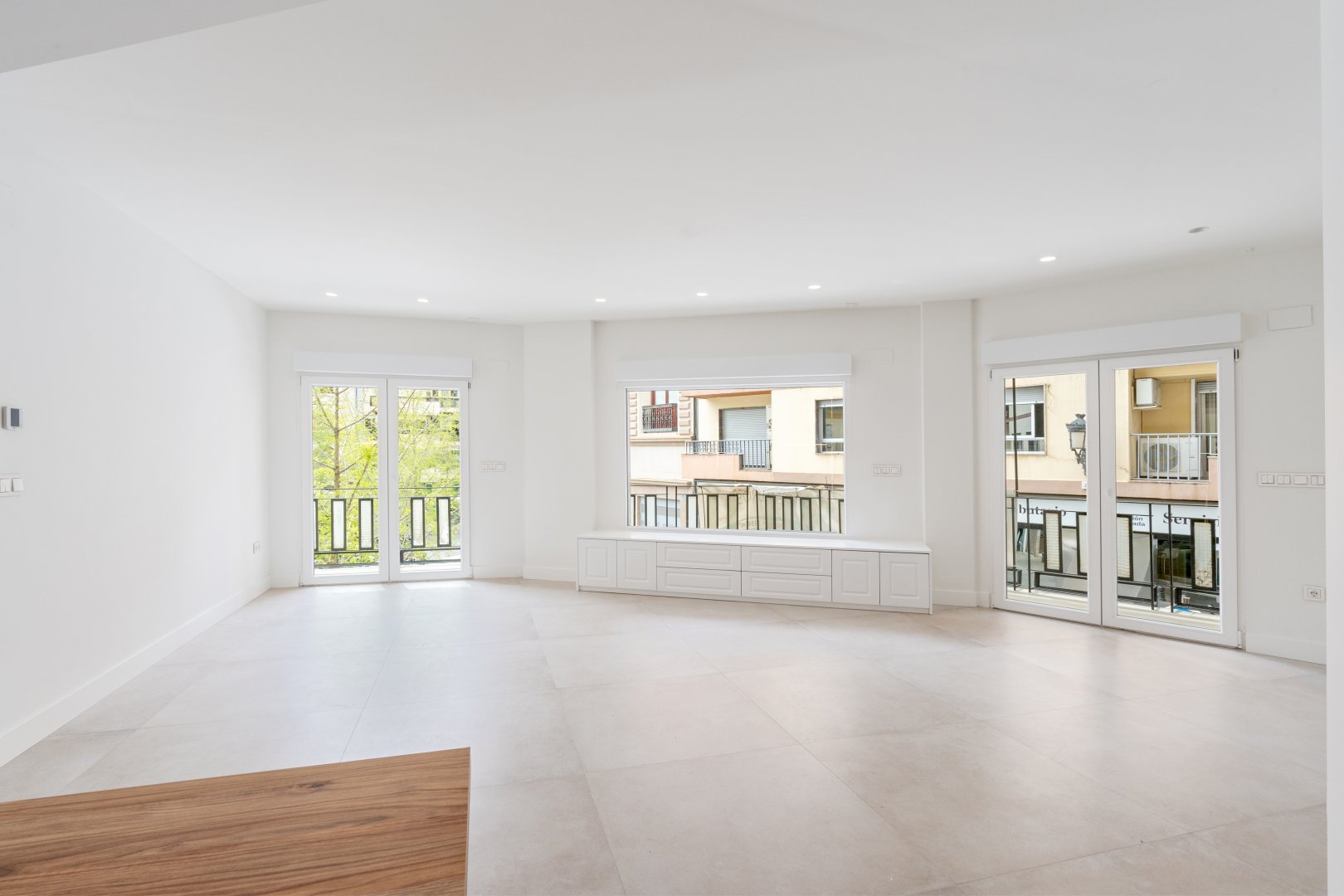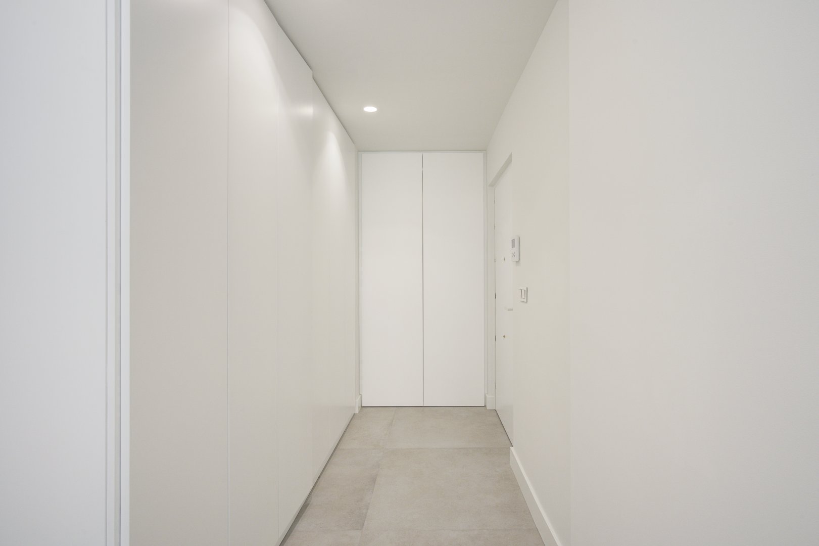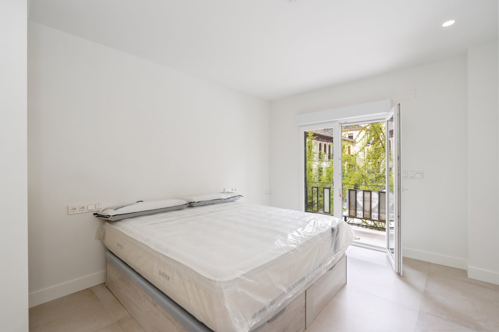 En cuanto a calidades, esta propiedad ha sido concebida bajo los más altos estándares. Dispone de un sistema de suelo radiante-refrigerante por aerotermia, climatización sectorizada por conductos mediante sistema Airzone, e instalación de calefacción central comunitaria ya preparada (a falta de radiadores). Las puertas interiores lacadas en blanco, los panelados con puertas invisibles integradas, y los suelos porcelánicos de gran formato refuerzan la sensación de armonía y continuidad en todos los espacios. La carpintería exterior de PVC con doble rotura de puente térmico y persianas motorizadas marca Schüco aseguran aislamiento térmico y acústico excepcionales. La vivienda incluye además un sistema de aspiración centralizada, instalación eléctrica moderna con tomas USB e internet en todas las estancias, y una iluminación arquitectónica con luminarias encastradas y foseados que aportan calidez y estilo. La cocina de alta gama equipada con electrodomésticos Siemens, los acabados en microcemento en cocina y baños, grifería y sanitarios premium, azulejos de diseño en duchas, y estucos en zonas comunes, completan una intervención arquitectónica impecable.