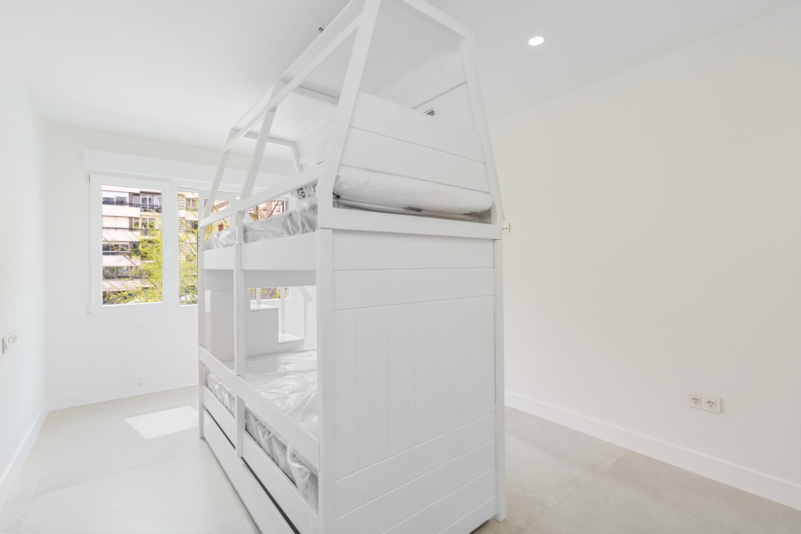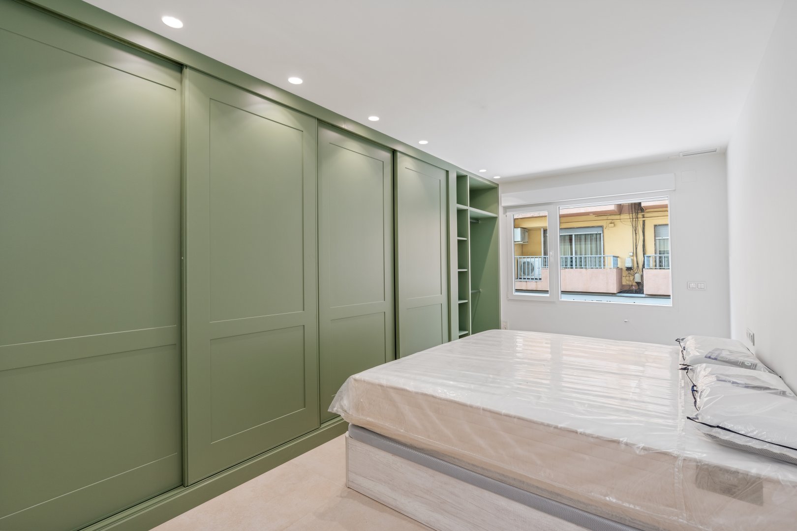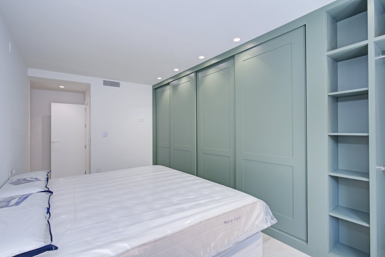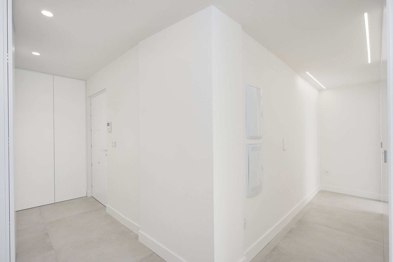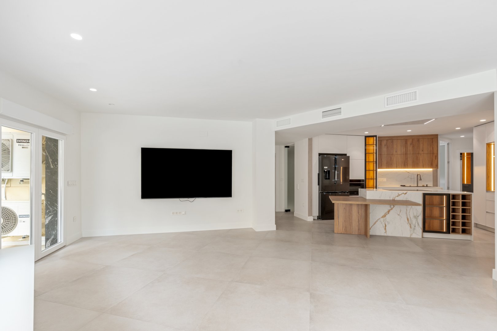 En cuanto a calidades, esta propiedad ha sido concebida bajo los más altos estándares. Dispone de un sistema de suelo radiante-refrigerante por aerotermia, climatización sectorizada por conductos mediante sistema Airzone, e instalación de calefacción central comunitaria ya preparada (a falta de radiadores). Las puertas interiores lacadas en blanco, los panelados con puertas invisibles integradas, y los suelos porcelánicos de gran formato refuerzan la sensación de armonía y continuidad en todos los espacios. La carpintería exterior de PVC con doble rotura de puente térmico y persianas motorizadas marca Schüco aseguran aislamiento térmico y acústico excepcionales. La vivienda incluye además un sistema de aspiración centralizada, instalación eléctrica moderna con tomas USB e internet en todas las estancias, y una iluminación arquitectónica con luminarias encastradas y foseados que aportan calidez y estilo. La cocina de alta gama equipada con electrodomésticos Siemens, los acabados en microcemento en cocina y baños, grifería y sanitarios premium, azulejos de diseño en duchas, y estucos en zonas comunes, completan una intervención arquitectónica impecable.