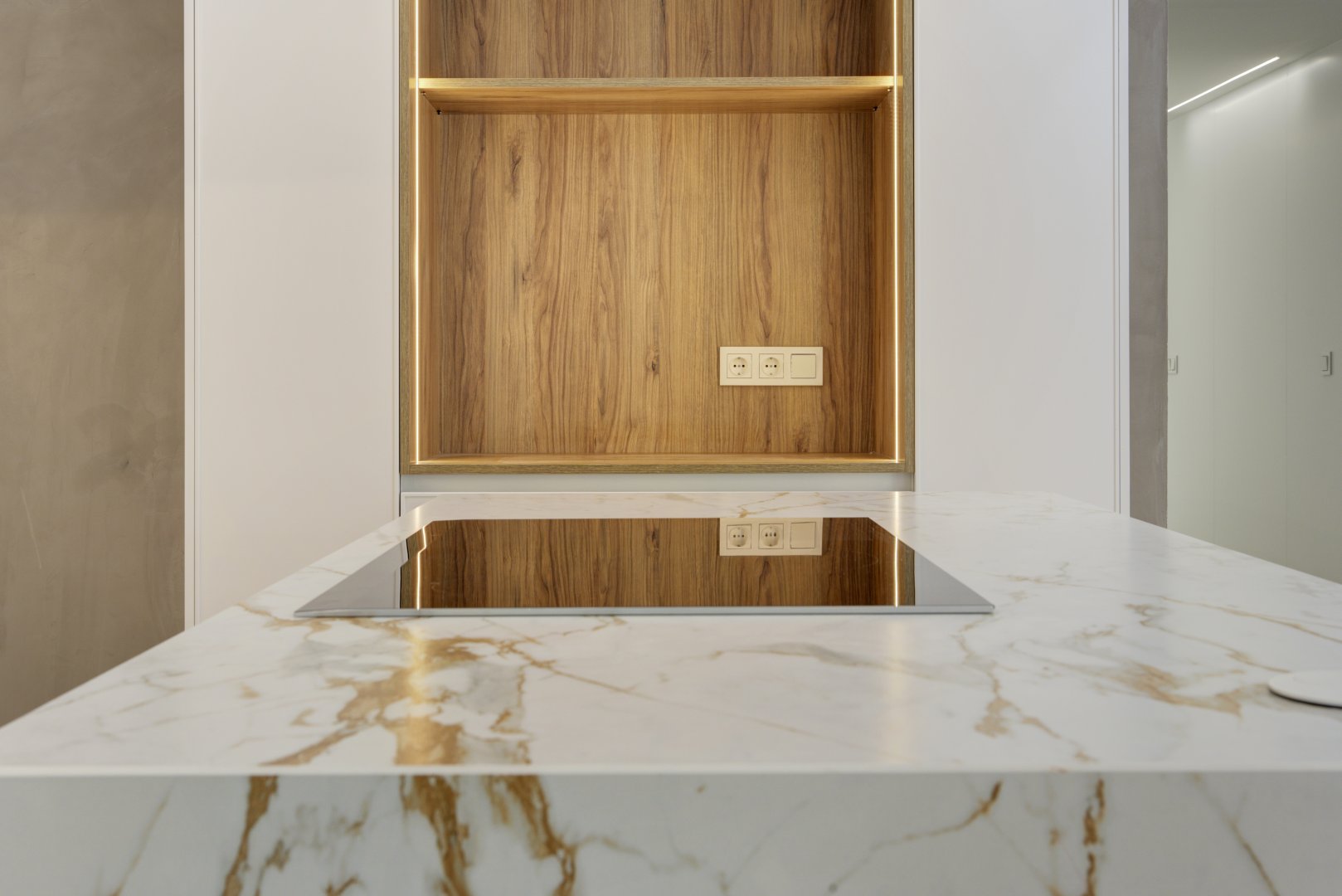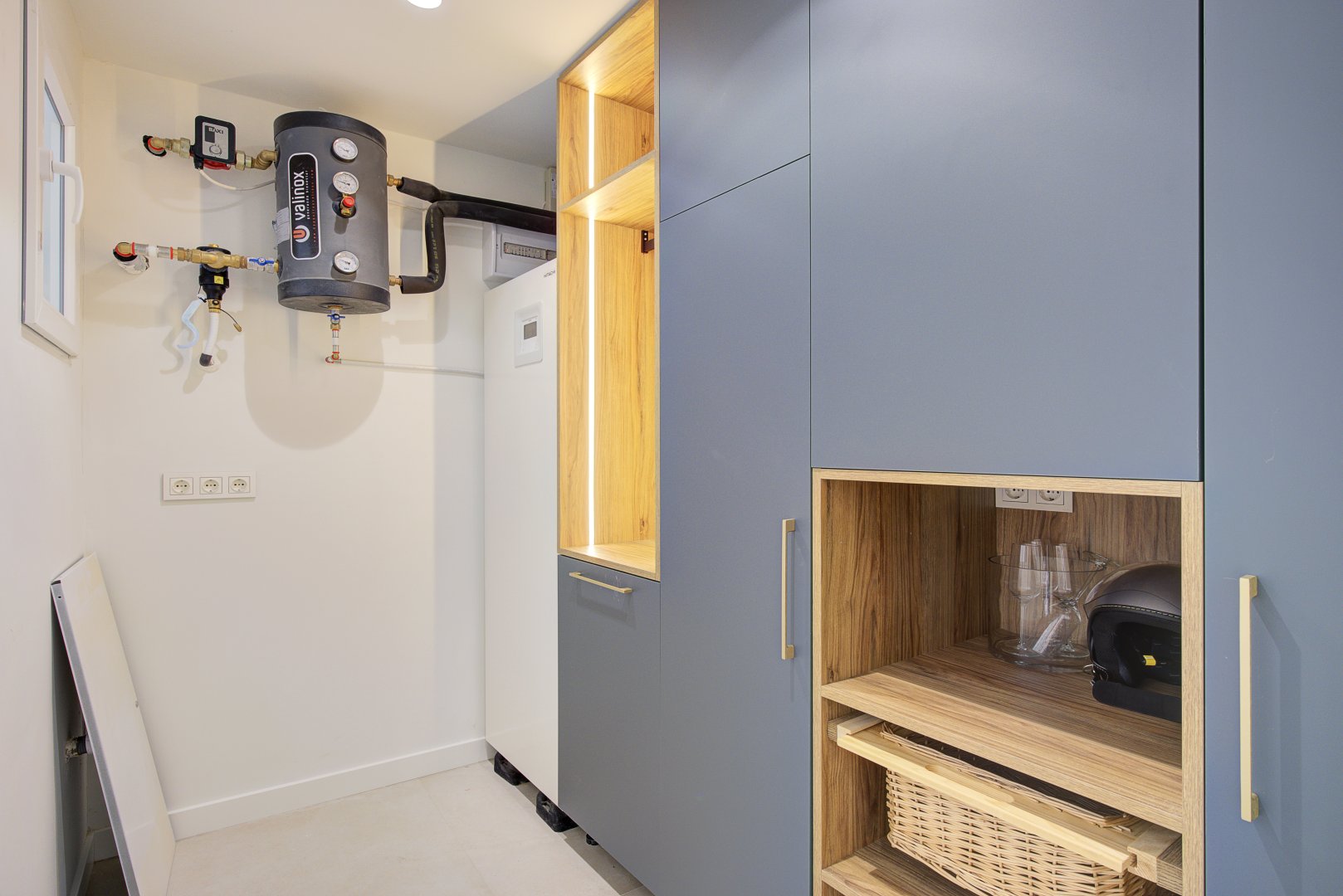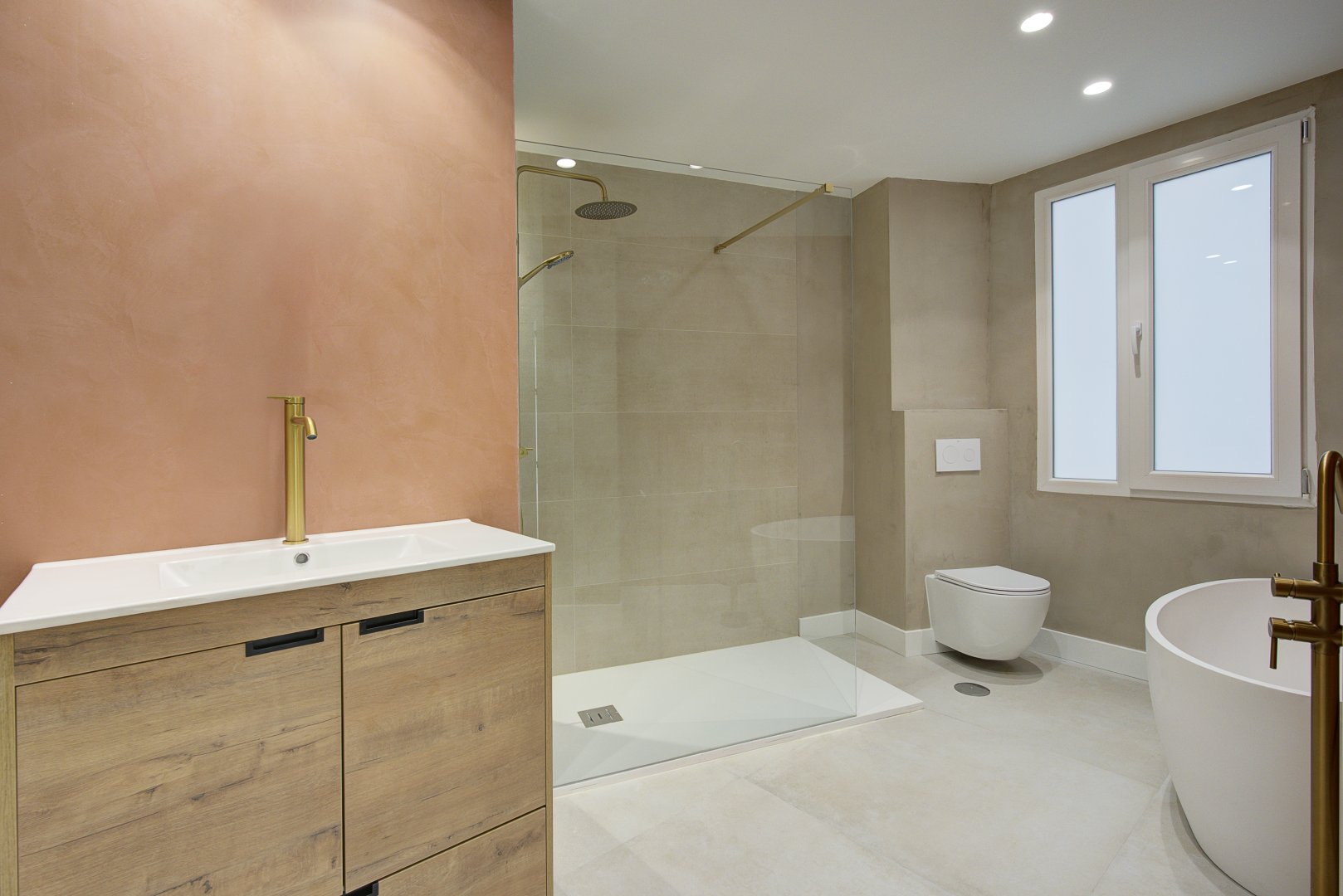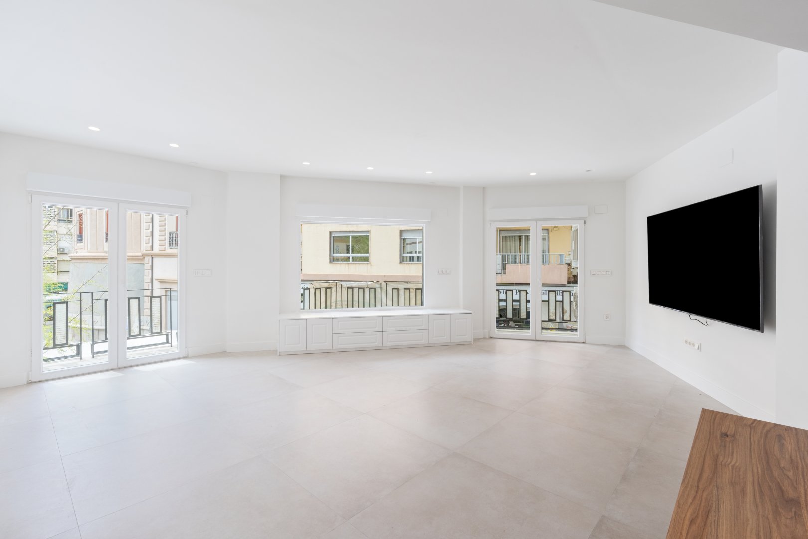 En cuanto a calidades, esta propiedad ha sido concebida bajo los más altos estándares. Dispone de un sistema de suelo radiante-refrigerante por aerotermia, climatización sectorizada por conductos mediante sistema Airzone, e instalación de calefacción central comunitaria ya preparada (a falta de radiadores). Las puertas interiores lacadas en blanco, los panelados con puertas invisibles integradas, y los suelos porcelánicos de gran formato refuerzan la sensación de armonía y continuidad en todos los espacios. La carpintería exterior de PVC con doble rotura de puente térmico y persianas motorizadas marca Schüco aseguran aislamiento térmico y acústico excepcionales. La vivienda incluye además un sistema de aspiración centralizada, instalación eléctrica moderna con tomas USB e internet en todas las estancias, y una iluminación arquitectónica con luminarias encastradas y foseados que aportan calidez y estilo. La cocina de alta gama equipada con electrodomésticos Siemens, los acabados en microcemento en cocina y baños, grifería y sanitarios premium, azulejos de diseño en duchas, y estucos en zonas comunes, completan una intervención arquitectónica impecable.