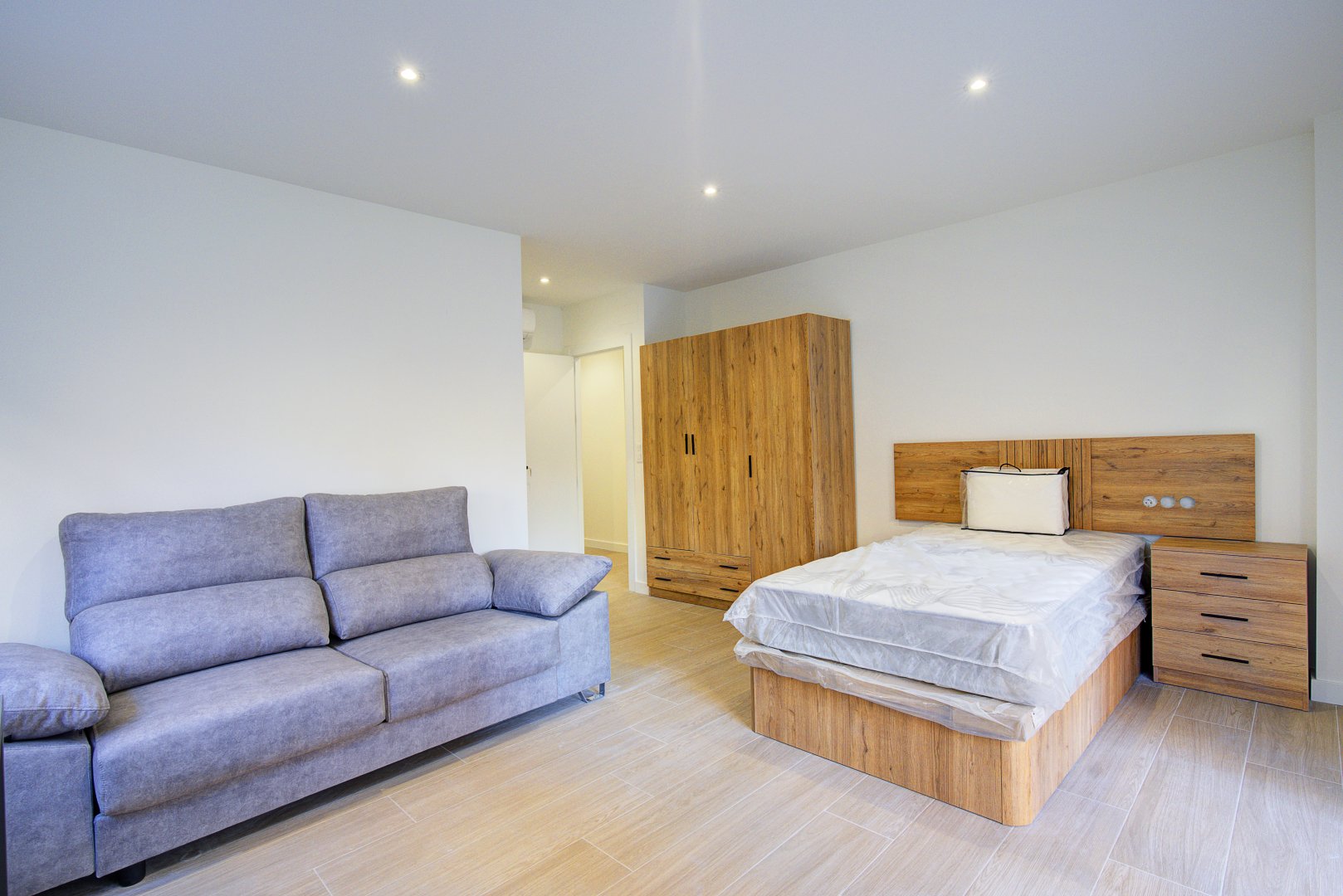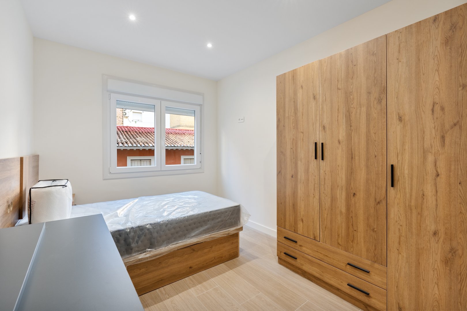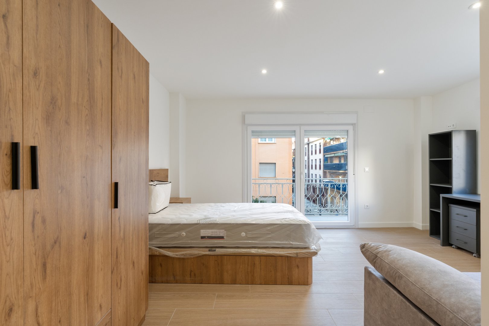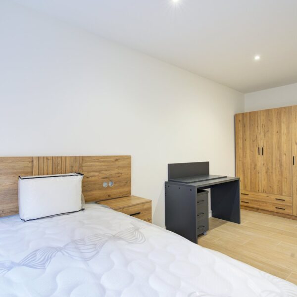 La reforma integral ha sido ejecutada con materiales de alta calidad y un gusto exquisito: suelos porcelánicos imitación madera, ventanas de PVC con excelente aislamiento y puertas lacadas en blanco con manivelas de cierre por clave o llave, un detalle que aporta seguridad y privacidad a cada estancia.