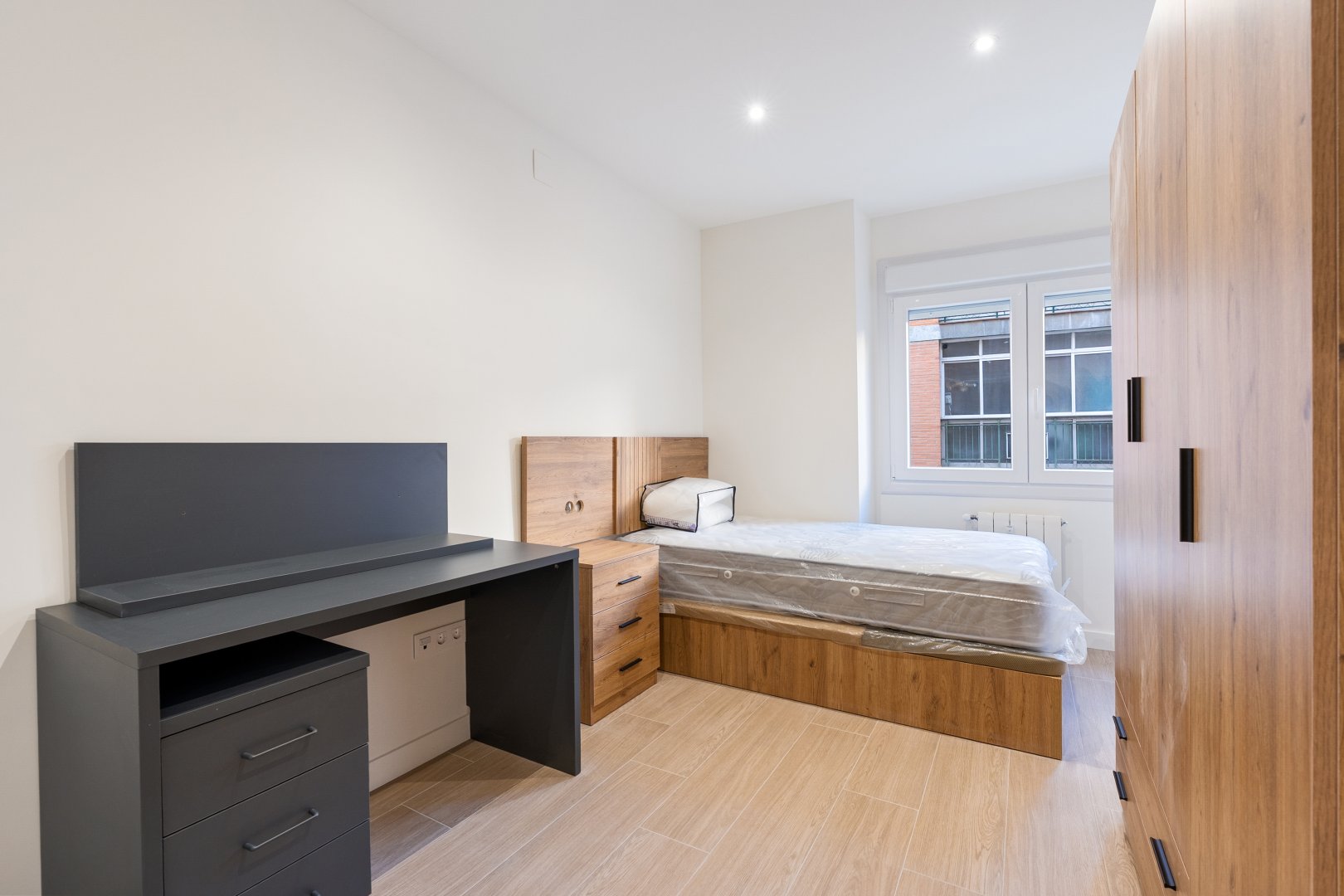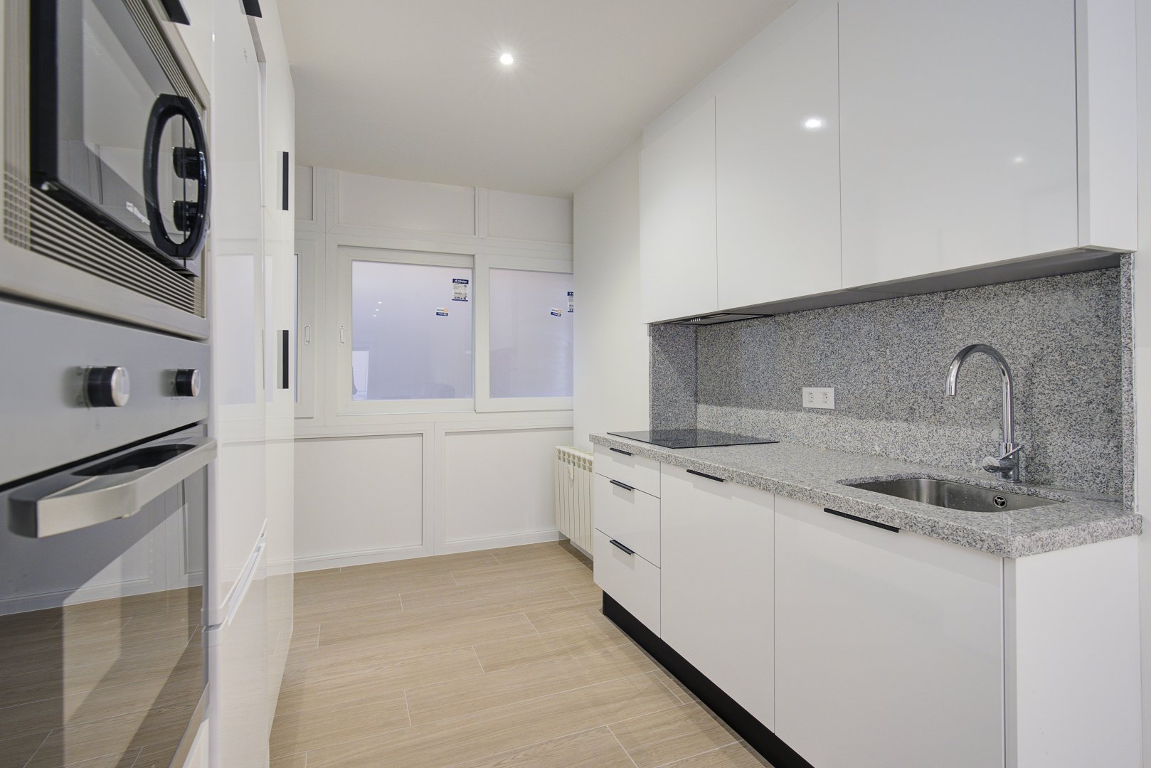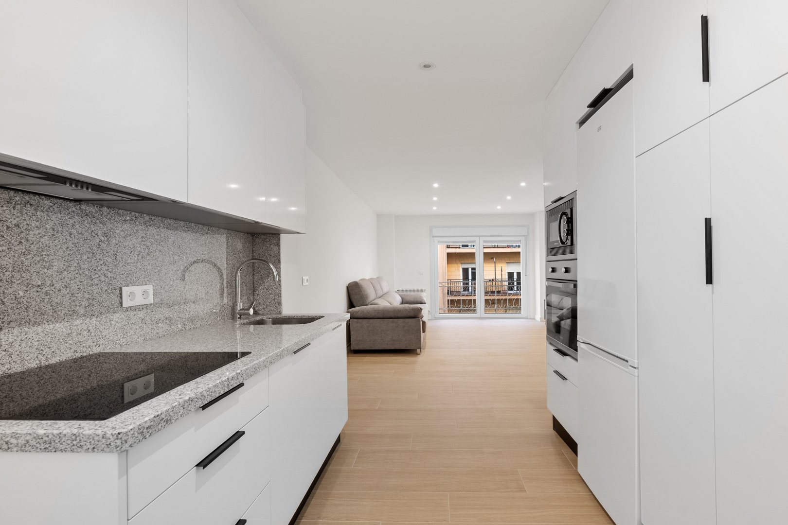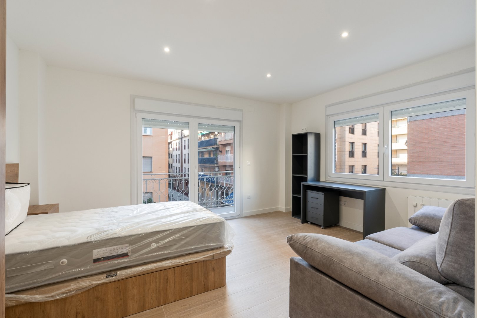 La reforma integral ha sido ejecutada con materiales de alta calidad y un gusto exquisito: suelos porcelánicos imitación madera, ventanas de PVC con excelente aislamiento y puertas lacadas en blanco con manivelas de cierre por clave o llave, un detalle que aporta seguridad y privacidad a cada estancia.