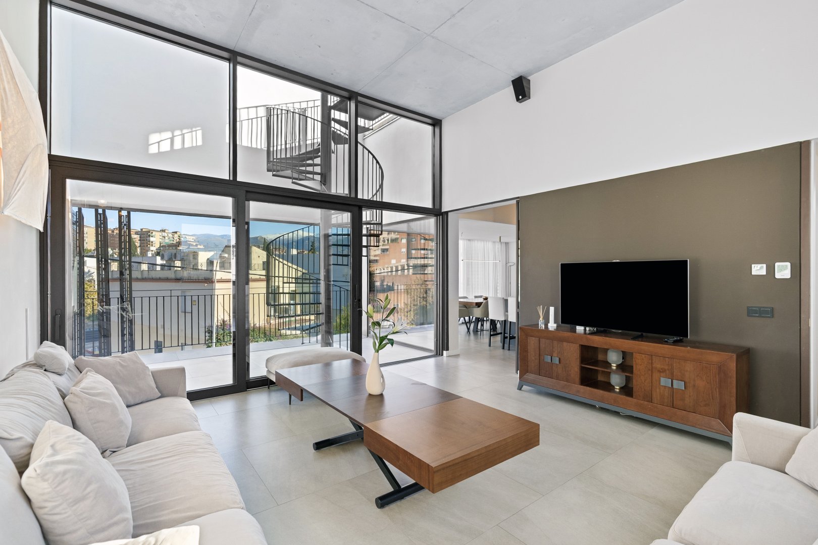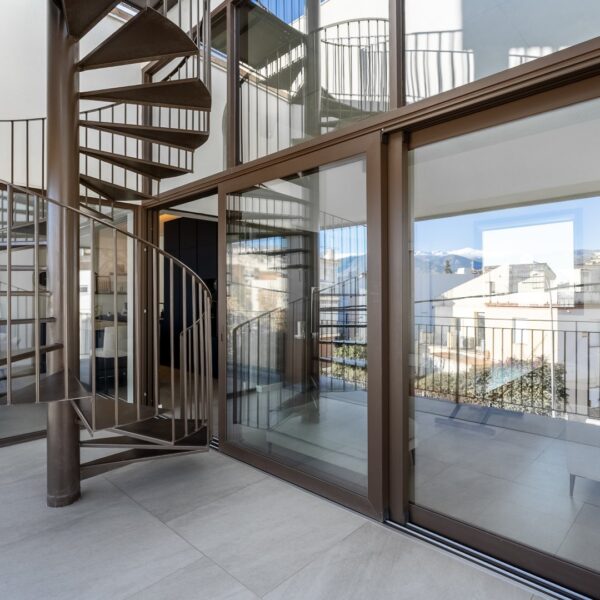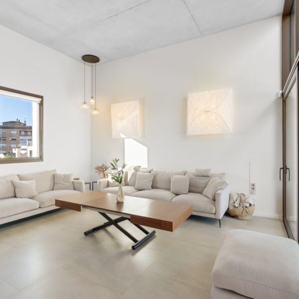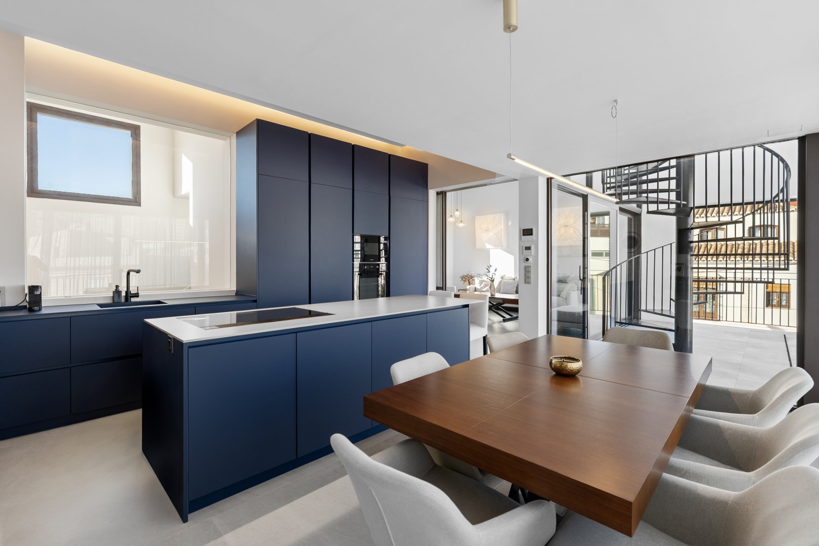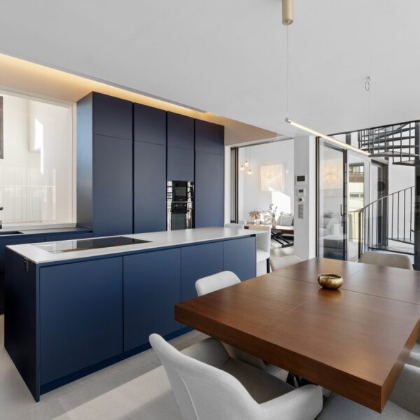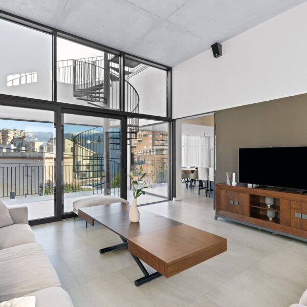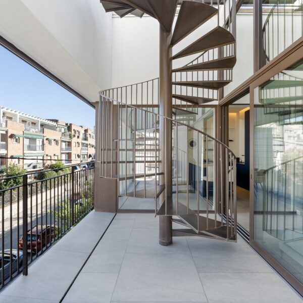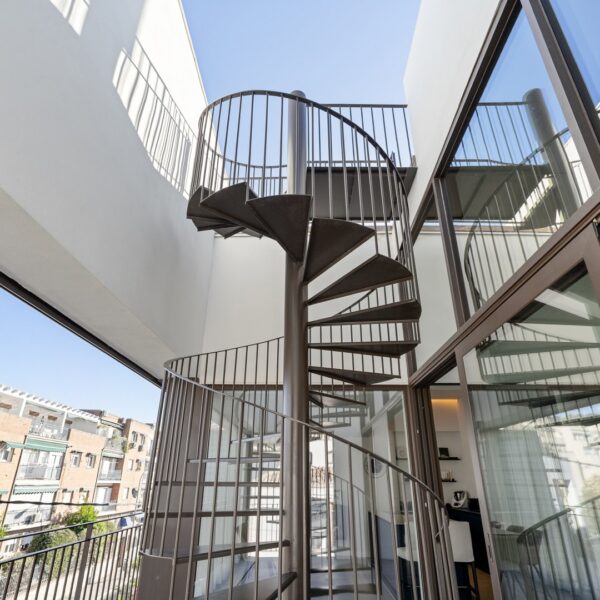 La segunda planta es el auténtico corazón social de la vivienda, un espacio de más de 60 m² donde la luz natural es protagonista gracias a las numerosas ventanas y aberturas. Se distribuye entre un salón amplio y una cocina-comedor de diseño equipada con electrodomésticos de alta gama. Ambos ambientes, con techos de aproximadamente cuatro metros de altura, pueden funcionar como un único espacio diáfano o separarse mediante una puerta corredera de cristal que queda completamente oculta en la pared. En este nivel se encuentra también un aseo de cortesía y una terraza exterior que prolonga la vida social hacia el aire libre. Desde esta terraza, una escalera de caracol —concebida como un elemento escultórico que acompaña la arquitectura vertical— conduce hasta la azotea, creando una transición elegante hacia el nivel superior de la vivienda.