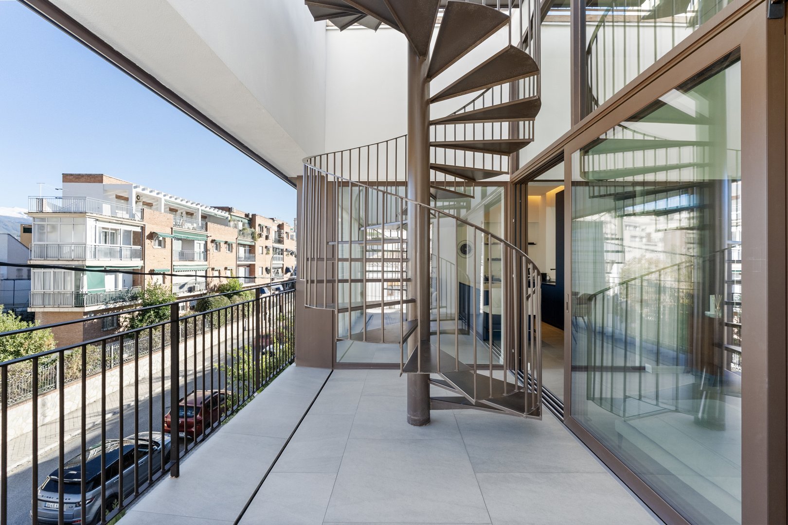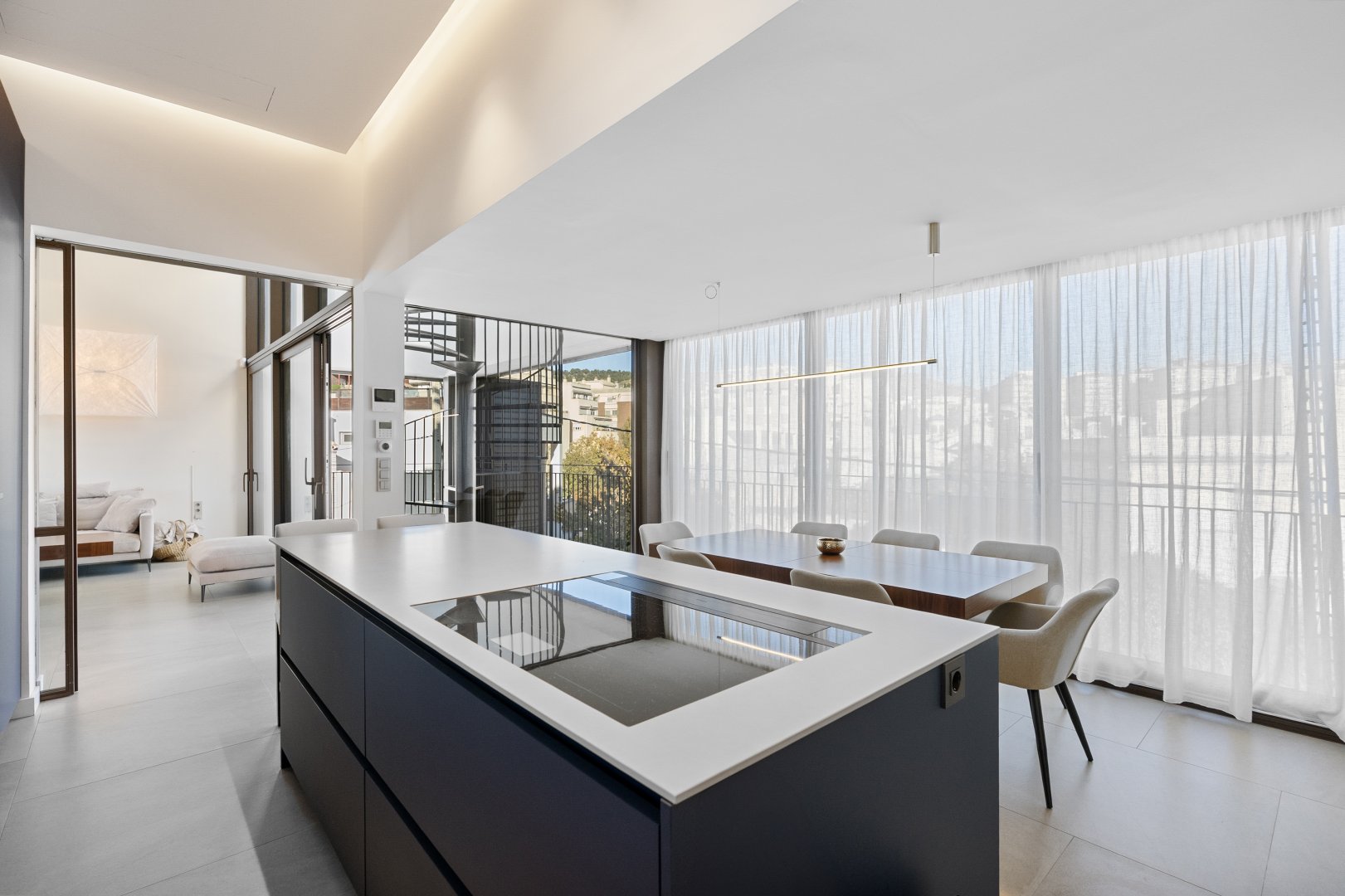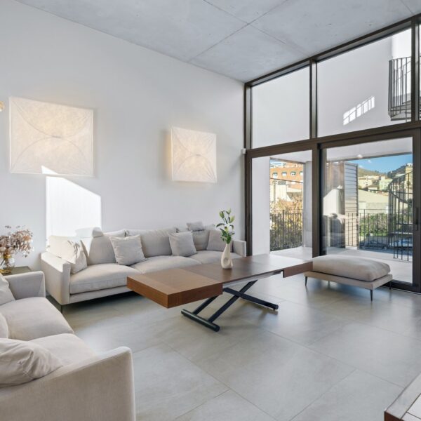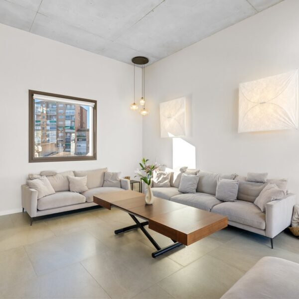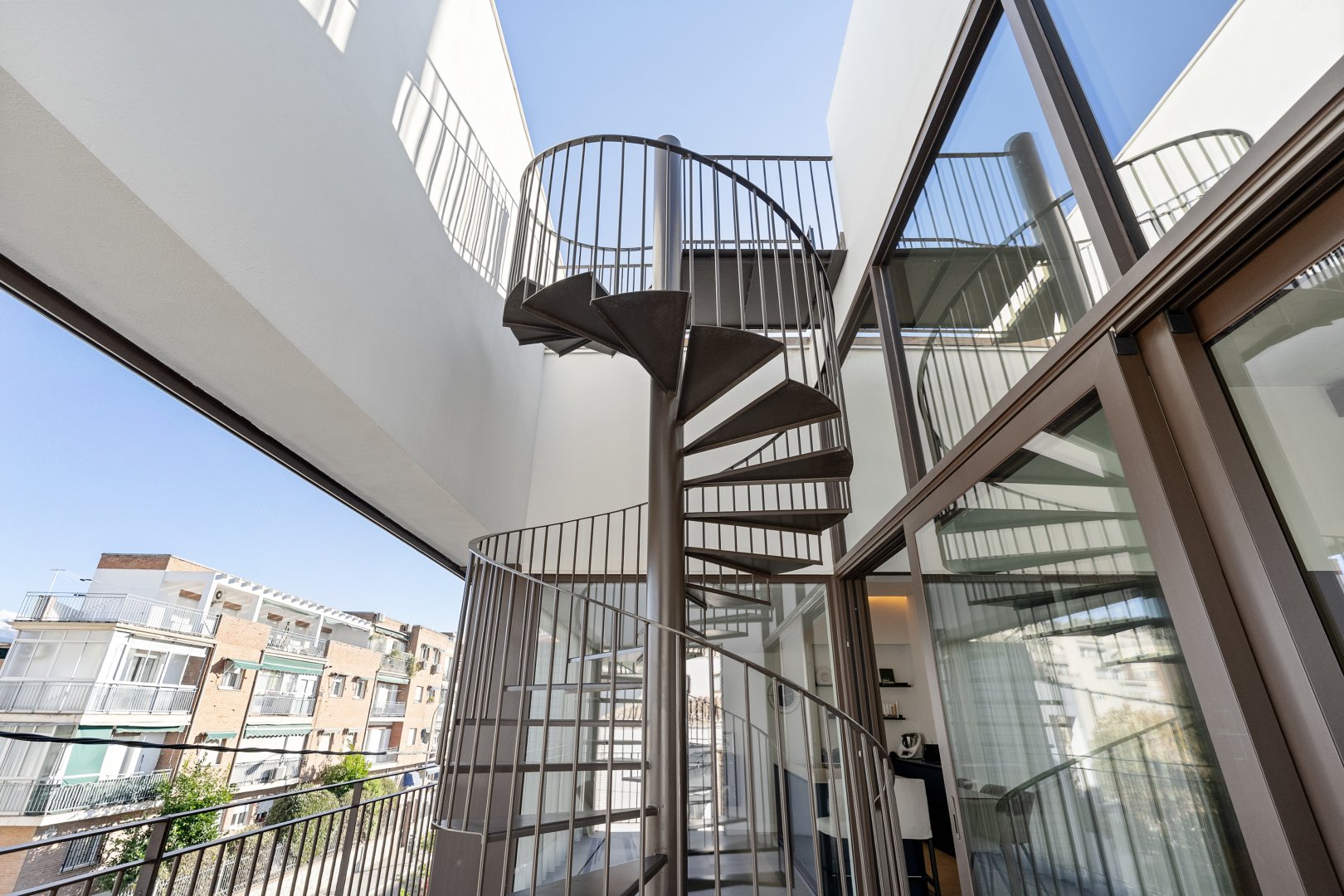 La segunda planta es el auténtico corazón social de la vivienda, un espacio de más de 60 m² donde la luz natural es protagonista gracias a las numerosas ventanas y aberturas. Se distribuye entre un salón amplio y una cocina-comedor de diseño equipada con electrodomésticos de alta gama. Ambos ambientes, con techos de aproximadamente cuatro metros de altura, pueden funcionar como un único espacio diáfano o separarse mediante una puerta corredera de cristal que queda completamente oculta en la pared. En este nivel se encuentra también un aseo de cortesía y una terraza exterior que prolonga la vida social hacia el aire libre. Desde esta terraza, una escalera de caracol —concebida como un elemento escultórico que acompaña la arquitectura vertical— conduce hasta la azotea, creando una transición elegante hacia el nivel superior de la vivienda.