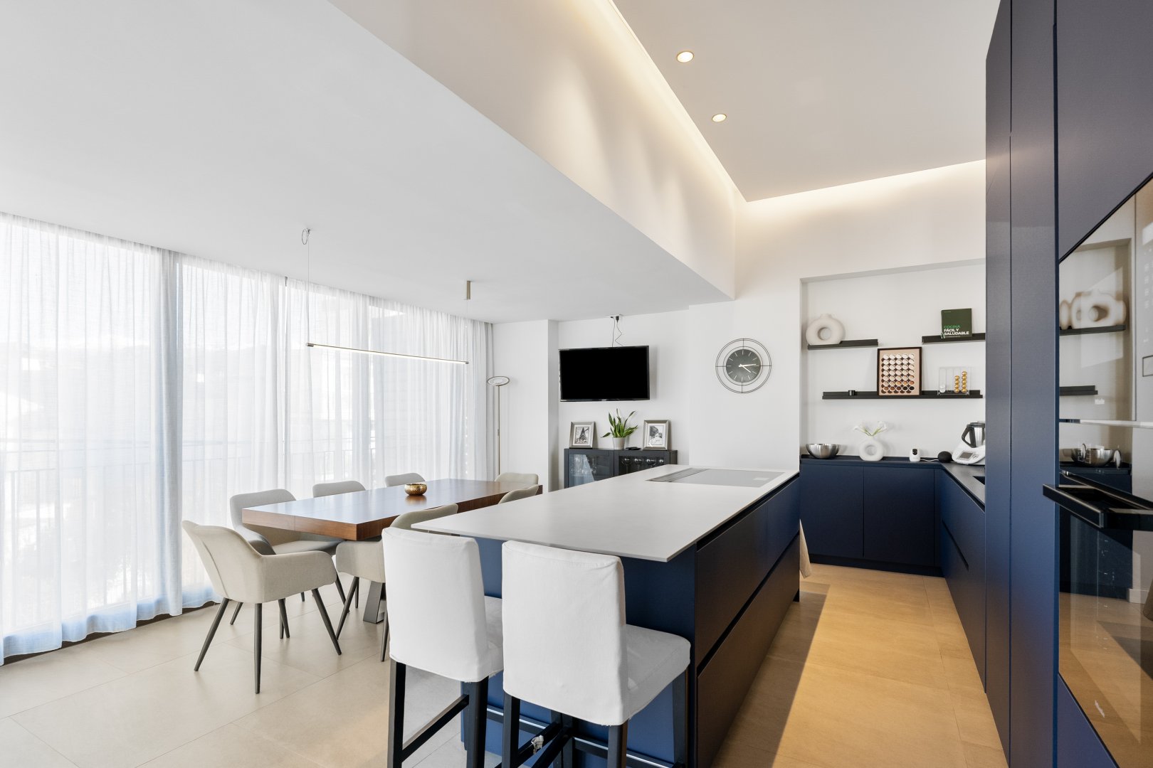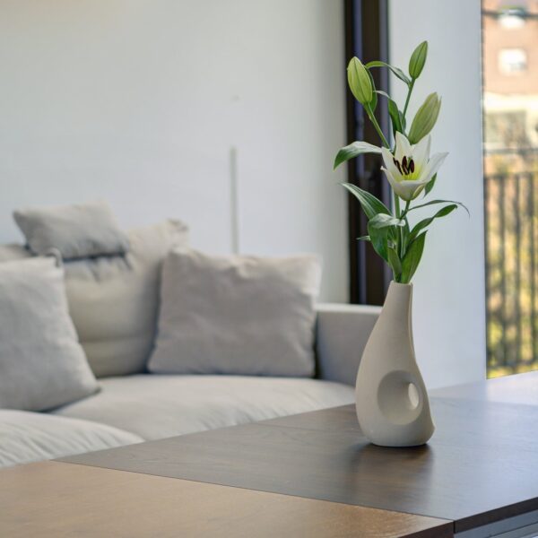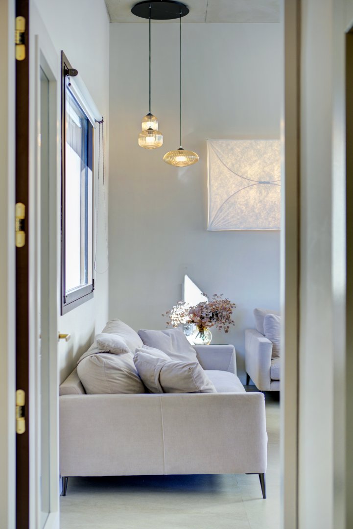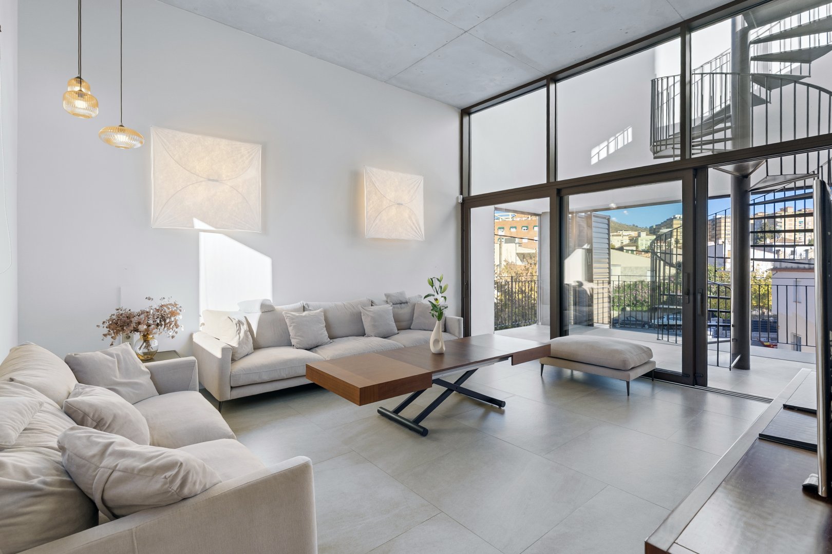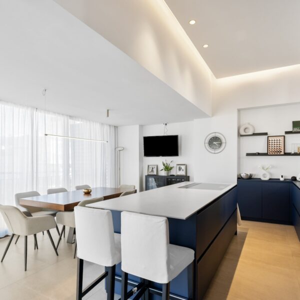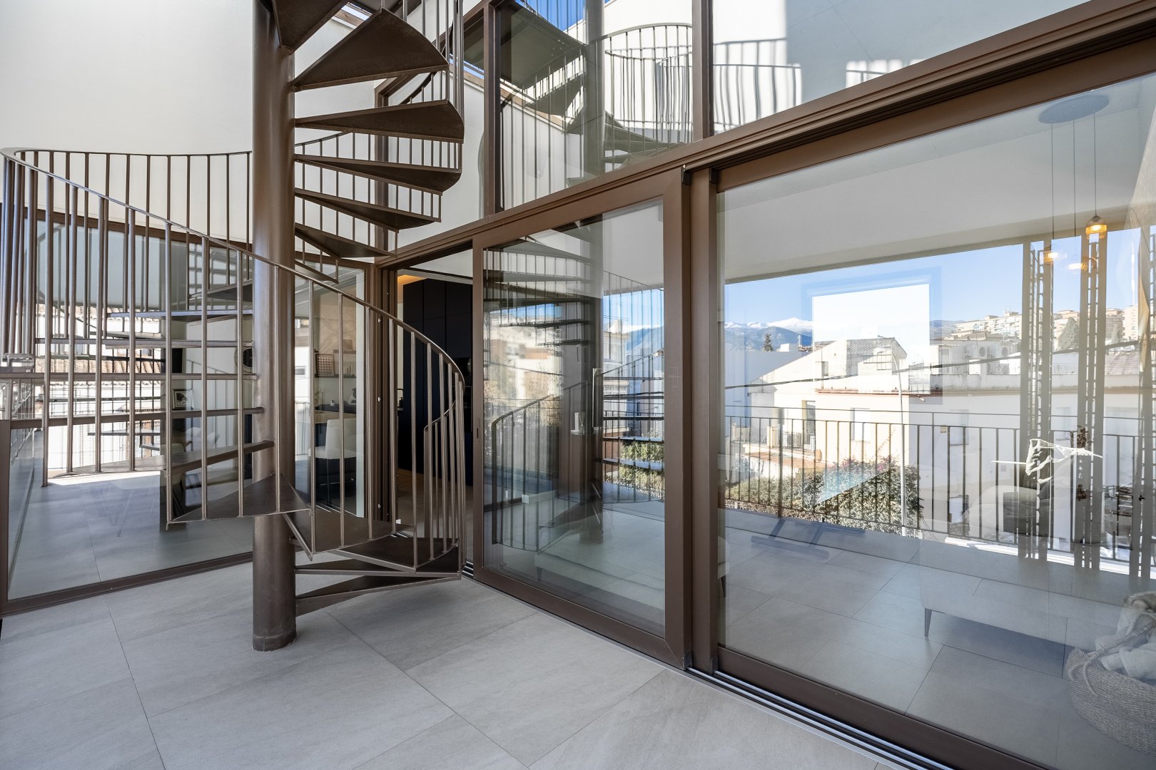 La segunda planta es el auténtico corazón social de la vivienda, un espacio de más de 60 m² donde la luz natural es protagonista gracias a las numerosas ventanas y aberturas. Se distribuye entre un salón amplio y una cocina-comedor de diseño equipada con electrodomésticos de alta gama. Ambos ambientes, con techos de aproximadamente cuatro metros de altura, pueden funcionar como un único espacio diáfano o separarse mediante una puerta corredera de cristal que queda completamente oculta en la pared. En este nivel se encuentra también un aseo de cortesía y una terraza exterior que prolonga la vida social hacia el aire libre. Desde esta terraza, una escalera de caracol —concebida como un elemento escultórico que acompaña la arquitectura vertical— conduce hasta la azotea, creando una transición elegante hacia el nivel superior de la vivienda.