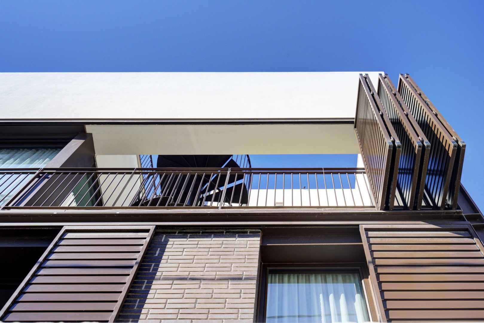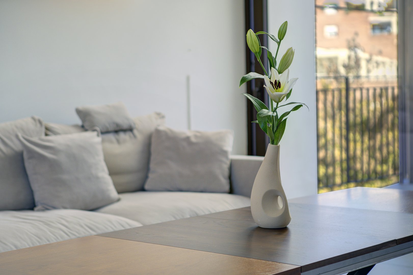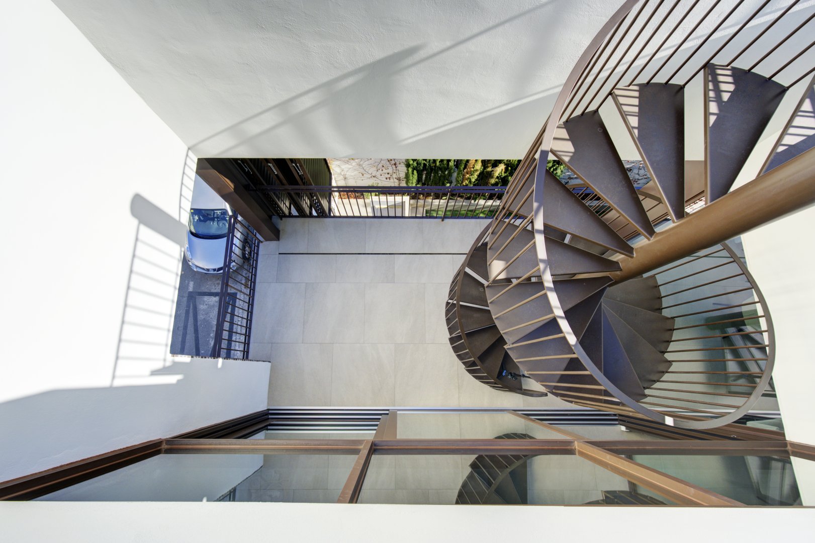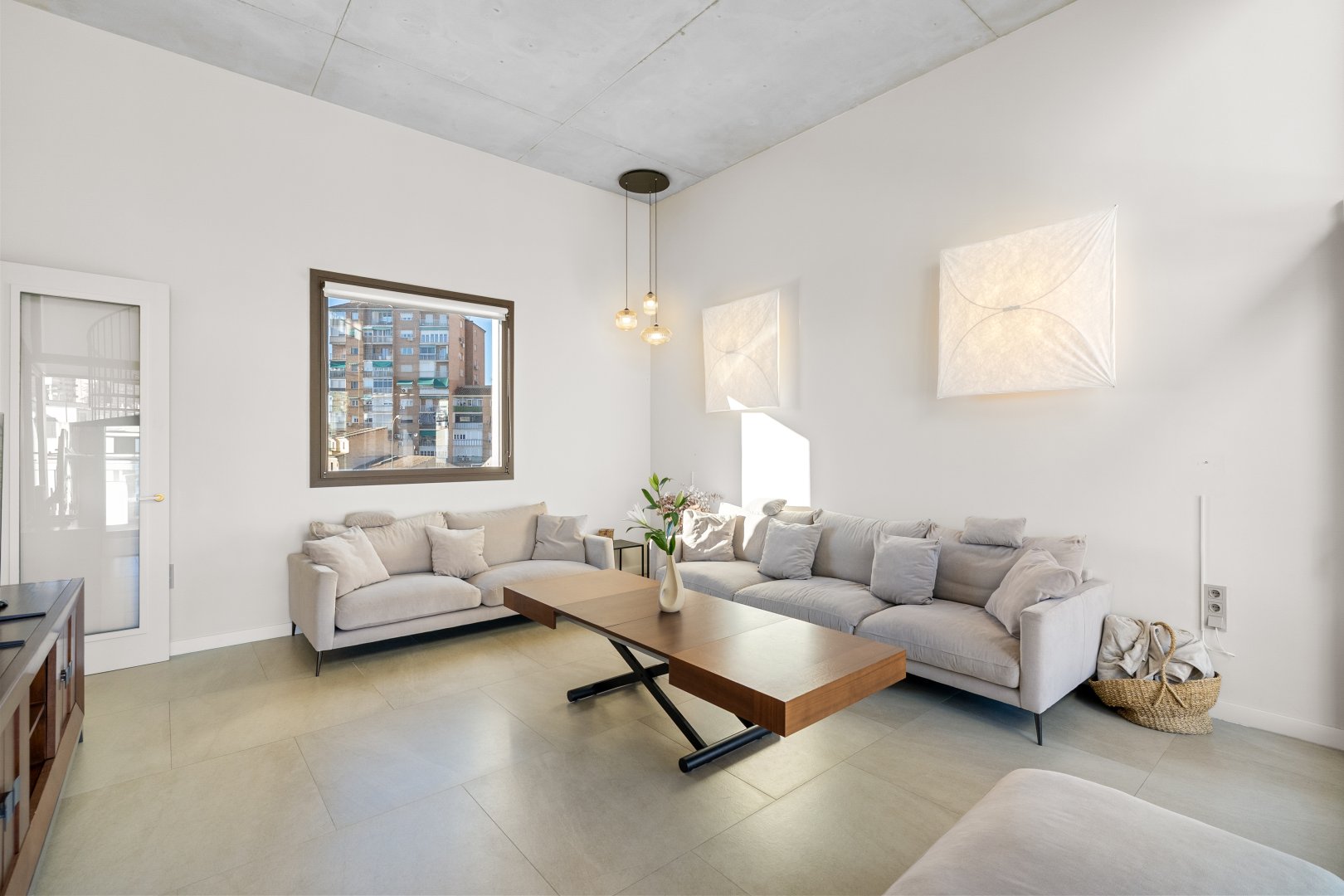 La segunda planta es el auténtico corazón social de la vivienda, un espacio de más de 60 m² donde la luz natural es protagonista gracias a las numerosas ventanas y aberturas. Se distribuye entre un salón amplio y una cocina-comedor de diseño equipada con electrodomésticos de alta gama. Ambos ambientes, con techos de aproximadamente cuatro metros de altura, pueden funcionar como un único espacio diáfano o separarse mediante una puerta corredera de cristal que queda completamente oculta en la pared. En este nivel se encuentra también un aseo de cortesía y una terraza exterior que prolonga la vida social hacia el aire libre. Desde esta terraza, una escalera de caracol —concebida como un elemento escultórico que acompaña la arquitectura vertical— conduce hasta la azotea, creando una transición elegante hacia el nivel superior de la vivienda.