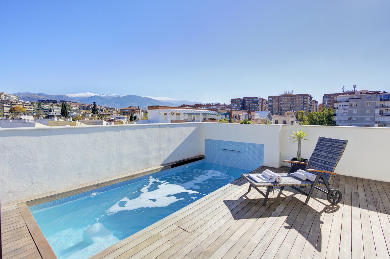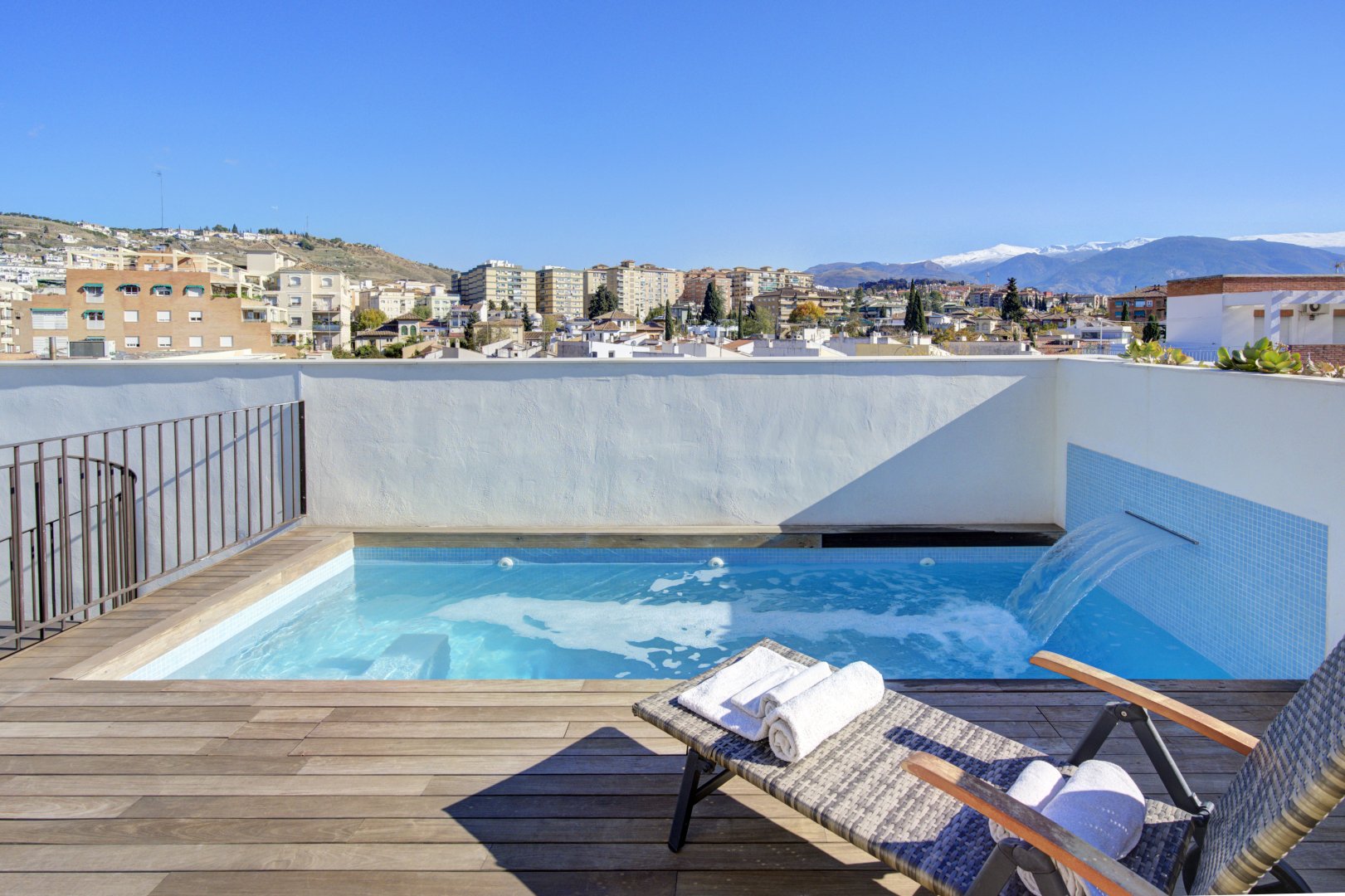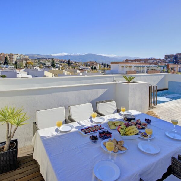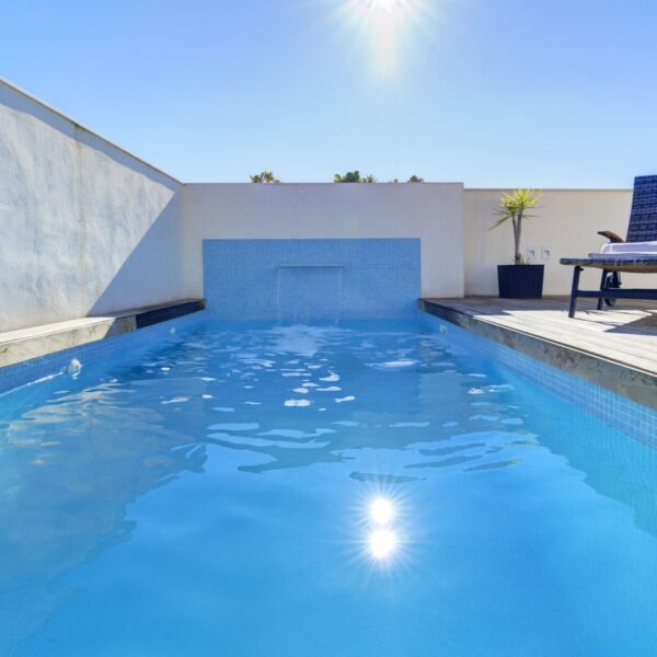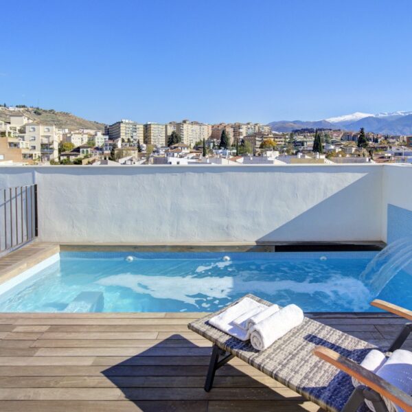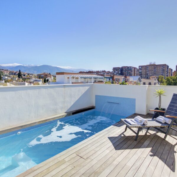 La azotea, accesible tanto por las escaleras como por el ascensor, ofrece un auténtico retiro privado: terraza con suelo de madera, piscina de cloración salina, zona de ducha y un espacio acogedor para reuniones al atardecer. Un toldo automático aporta sombra y confort cuando se desee. Es un área pensada no solo para disfrutar, sino para vivir momentos memorables con absoluta privacidad.