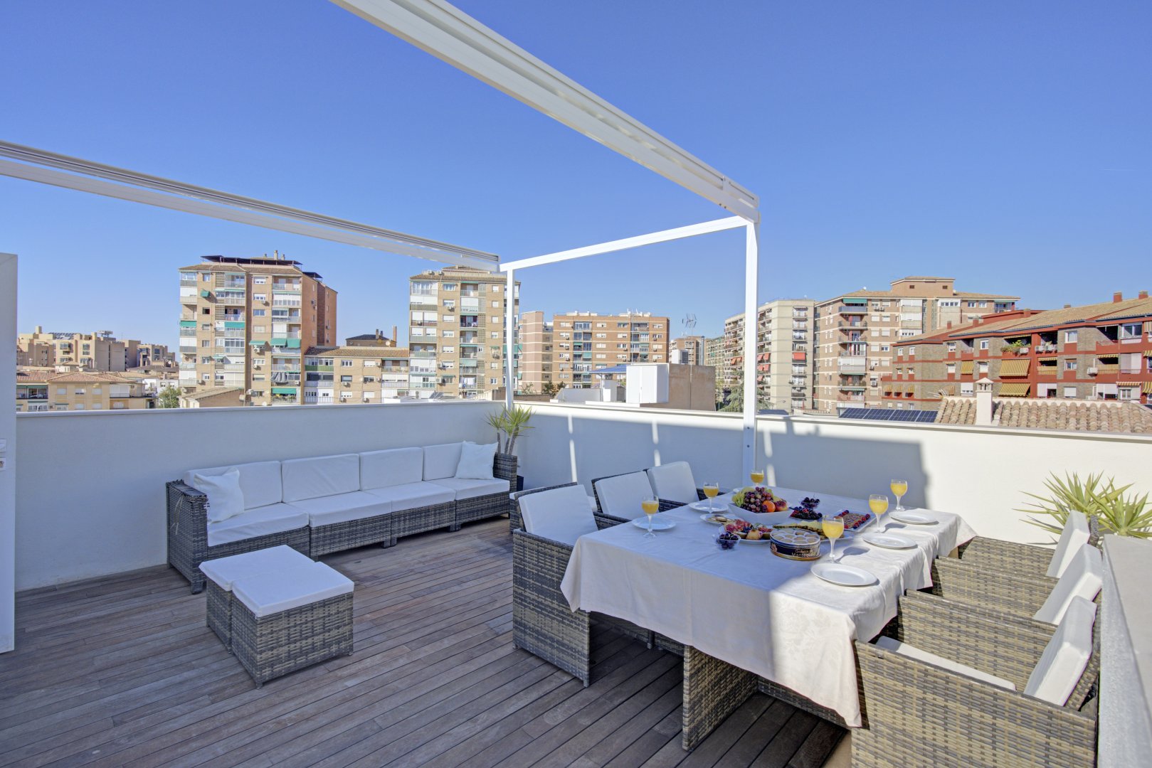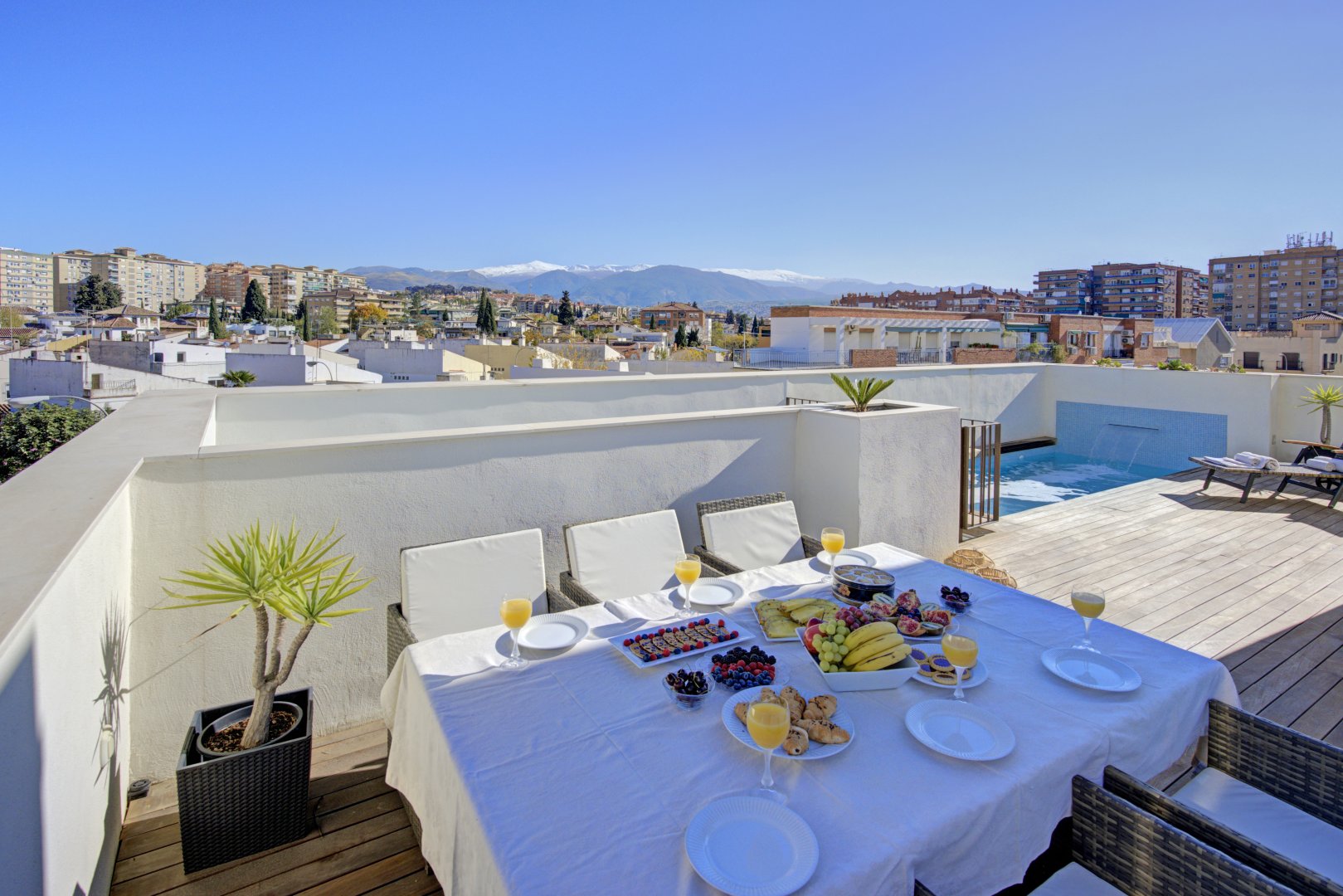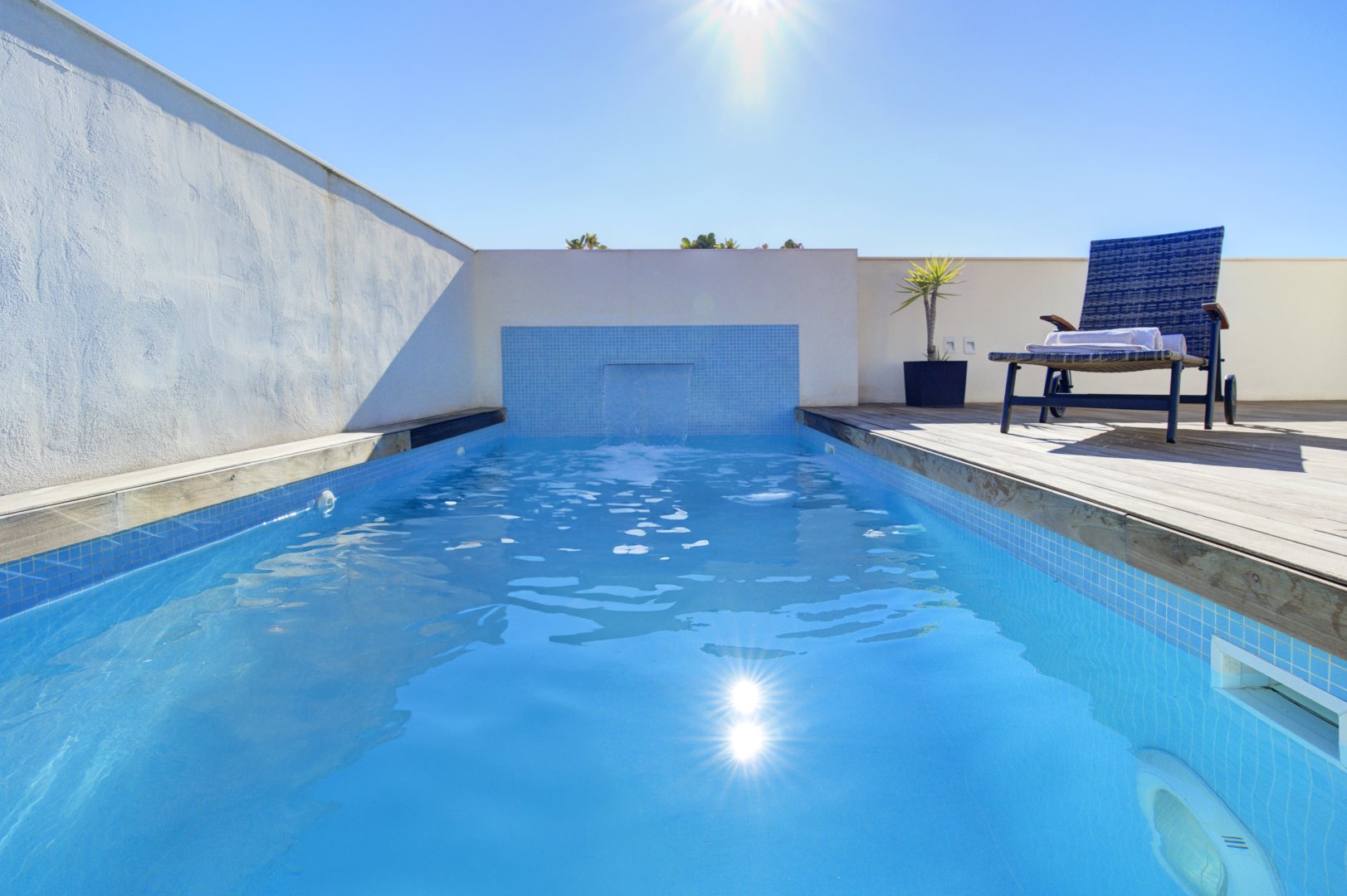 La azotea, accesible tanto por las escaleras como por el ascensor, ofrece un auténtico retiro privado: terraza con suelo de madera, piscina de cloración salina, zona de ducha y un espacio acogedor para reuniones al atardecer. Un toldo automático aporta sombra y confort cuando se desee. Es un área pensada no solo para disfrutar, sino para vivir momentos memorables con absoluta privacidad.