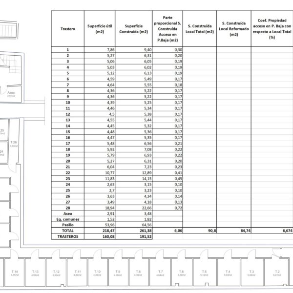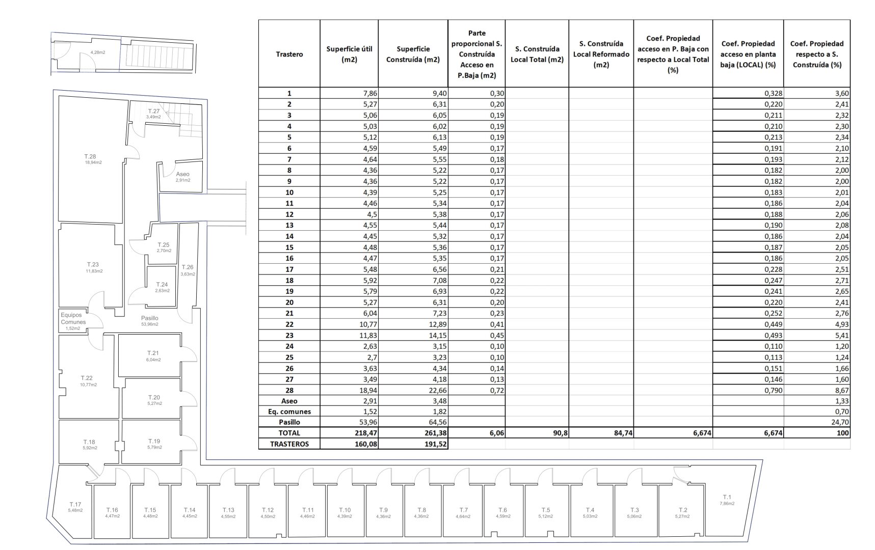 Se trata de un local de más de 260 m², destinado a trasteros, que ya ha sido dividido en 28 unidades de distintos tamaños, adaptadas a las necesidades reales del mercado. Actualmente, los trasteros ya se encuentran en fase de comercialización, lo que permite al inversor obtener ingresos desde el primer momento y reducir al mínimo los plazos de puesta en rentabilidad.