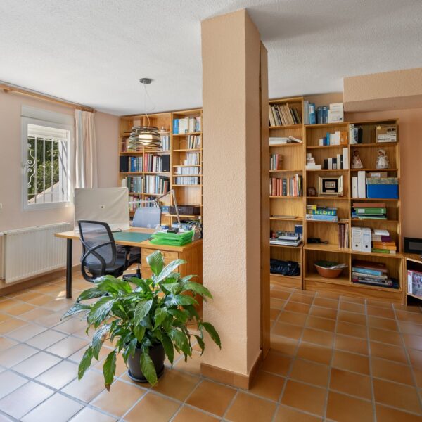 Uno de los grandes atractivos de esta vivienda se encuentra en la planta jardín, un nivel especialmente versátil y lleno de posibilidades. En ella encontramos una espaciosa sala de estar con chimenea y acceso directo al jardín, un ambiente perfecto como zona de reunión, salón de invierno, espacio de ocio o estancia independiente para disfrutar en cualquier época del año. En esta planta también se sitúa una amplia habitación, ideal como trastero, despacho, cuarto de juegos o estancia auxiliar, en función de las necesidades de cada familia.